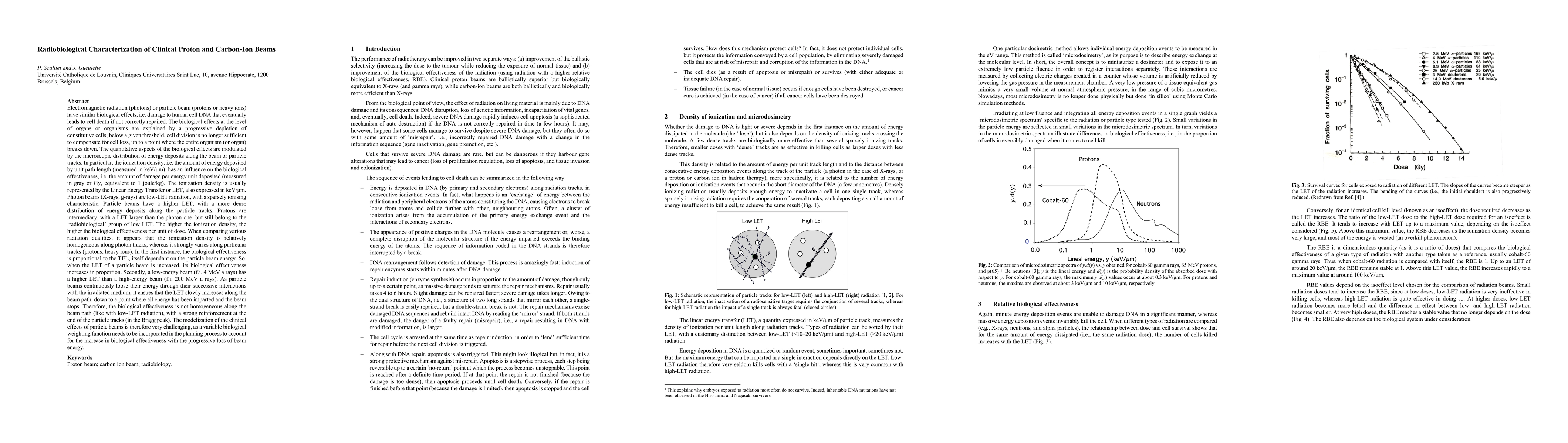 Electromagnetic radiation (photons) or particle beam (protons or heavy ions) have similar biological effects, i.e. damage to human cell DNA that eventually leads to cell death if not correctly repaired. The biological effects at the level of organs or organisms are explained by a progressive depletion of constitutive cells; below a given threshold, cell division is no longer sufficient to compensate for cell loss, up to a point where the entire organism (or organ) breaks down. The quantitative aspects of the biological effects are modulated by the microscopic distribution of energy deposits along the beam or particle tracks. In particular, the ionization density, i.e. the amount of energy deposited by unit path length (measured in keV/{\mu}m), has an influence on the biological effectiveness, i.e. the amount of damage per energy unit deposited (measured in gray or Gy, equivalent to 1 joule/kg). The ionization density is usually represented by the Linear Energy Transfer or LET, also expressed in keV/{\mu}m. Photon beams (X-rays, g-rays) are low-LET radiation, with a sparsely ionising characteristic. Particle beams have a higher LET, with a more dense distribution of energy deposits along the particle tracks. Protons are intermediary, with a LET larger than the photon one, but still belong to the 'radiobiological' group of low LET. The higher the ionization density, the higher the biological effectiveness per unit of dose.