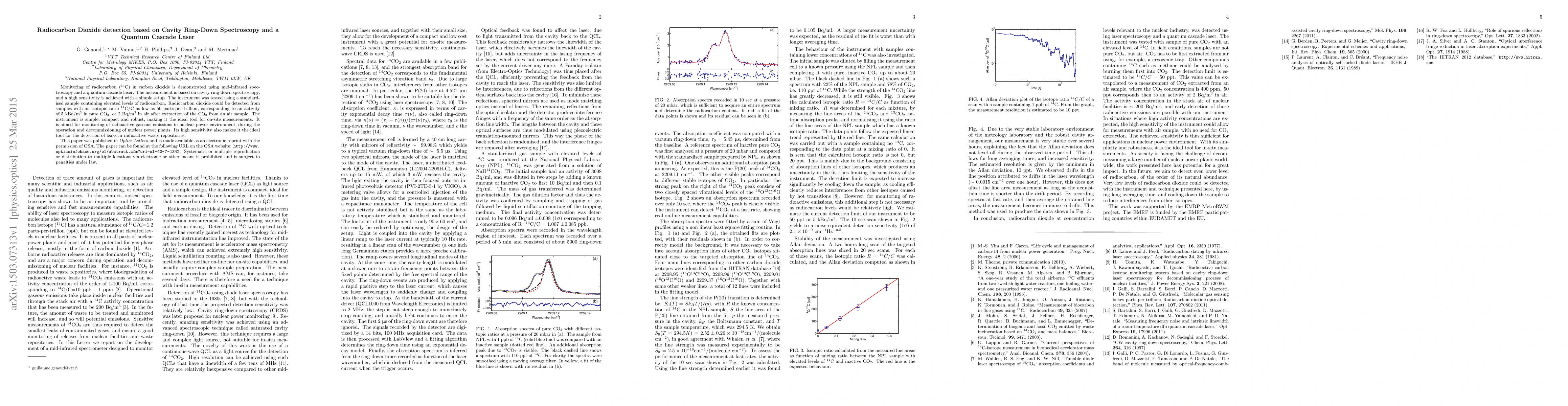 Monitoring of radiocarbon ($^{14}$C) in carbon dioxide is demonstrated using mid-infrared spectroscopy and a quantum cascade laser. The measurement is based on cavity ring-down spectroscopy, and a high sensitivity is achieved with a simple setup. The instrument was tested using a standardised sample containing elevated levels of radiocarbon. Radiocarbon dioxide could be detected from samples with an isotopic ratio $^{14}$C/C as low as 50 parts-per-trillion, corresponding to an activity of 5 kBq/m$^3$ in pure CO$_2$, or 2 Bq/m$^3$ in air after extraction of the CO$_2$ from an air sample. The instrument is simple, compact and robust, making it the ideal tool for on-site measurements. It is aimed for monitoring of radioactive gaseous emissions in nuclear power environment, during the operation and decommissioning of nuclear power plants. Its high sensitivity also makes it the ideal tool for the detection of leaks in radioactive waste repositories.