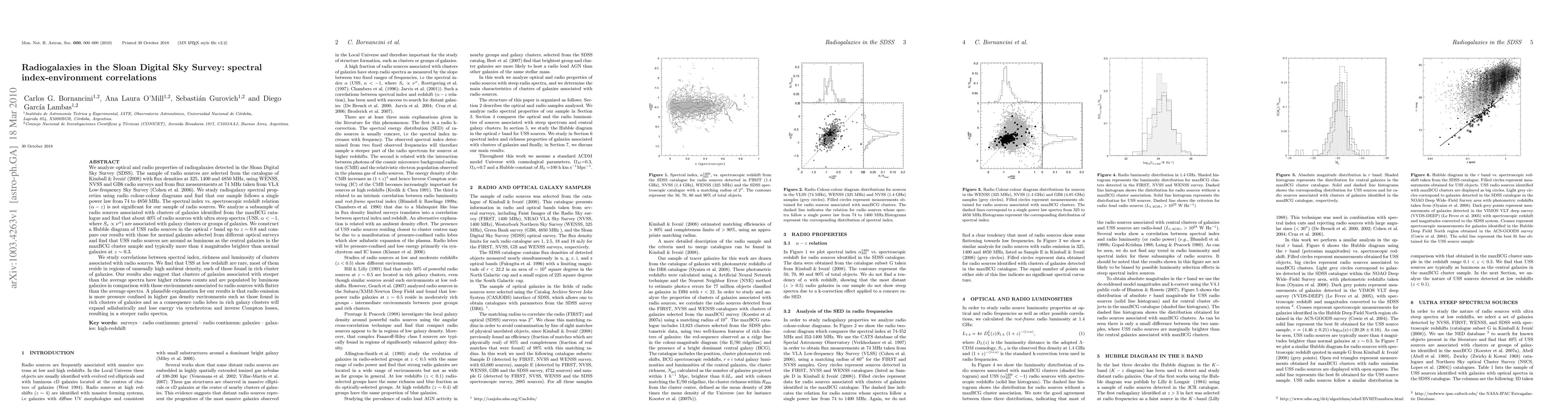 We analyze optical and radio properties of radiogalaxies detected in the Sloan Digital Sky Survey (SDSS). The sample of radio sources are selected from the catalogue of Kimball & Ivezi\'c (2008) with flux densities at 325, 1400 and 4850 MHz, using WENSS, NVSS and GB6 radio surveys and from flux measurements at 74 MHz taken from VLA Low-frequency Sky Survey \citep{cohen}. We study radiogalaxy spectral properties using radio colour-colour diagrams and find that our sample follows a single power law from 74 to 4850 MHz. The spectral index vs. spectroscopic redshift relation ($\alpha-z$) is not significant for our sample of radio sources. We analyze a subsample of radio sources associated with clusters of galaxies identified from the maxBCG catalogue and find that about 40% of radio sources with ultra steep spectra (USS, $\alpha<-1$, where $S_\nu \propto \nu^{\alpha}$) are associated with galaxy clusters or groups of galaxies. We construct a Hubble diagram of USS radio sources in the optical $r$ band up to $z\sim0$.8 and compare our results with those for normal galaxies selected from different optical surveys and find that USS radio sources are around as luminous as the central galaxies in the maxBCG cluster sample and typically more than 4 magnitudes brighter than normal galaxies at $z\sim0$.3. We study correlations between spectral index, richness and luminosity of clusters associated with radio sources. We find that USS at low redshift are rare, most of them reside in regions of unusually high ambient density, such of those found in rich cluster of galaxies. Our results also suggest that clusters of galaxies associated with steeper than the average spectra have higher richness counts and are populated by luminous galaxies in comparison with those environments associated to radio sources with flatter than the average spectra. A plausible explanation for our results is that radio emission is more pressure confined in higher gas density environments such as those found in rich clusters of galaxies and as a consequence radio lobes in rich galaxy clusters will expand adiabatically and lose energy via synchrotron and inverse Compton losses, resulting in a steeper radio spectra.