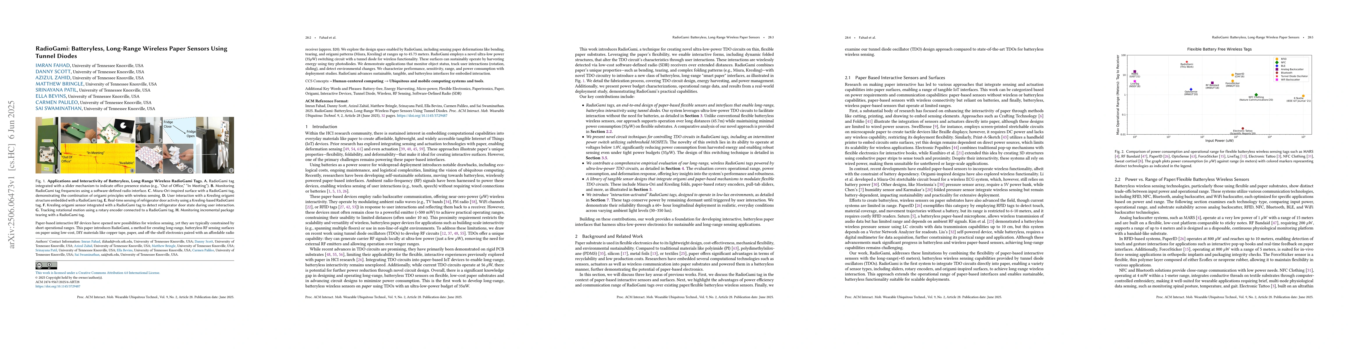 The paper introduces RadioGami, a method to create long-range, batteryless RF sensing surfaces on paper using inexpensive materials. It employs a novel ultra-low power circuit with a tunnel diode for wireless functionality, enabling sensing of paper deformations and interactions at ranges up to 45.73 meters, while sustainably operating via energy harvesting from tiny photodiodes. Applications include monitoring object status, tracking user interactions, and detecting environmental changes.