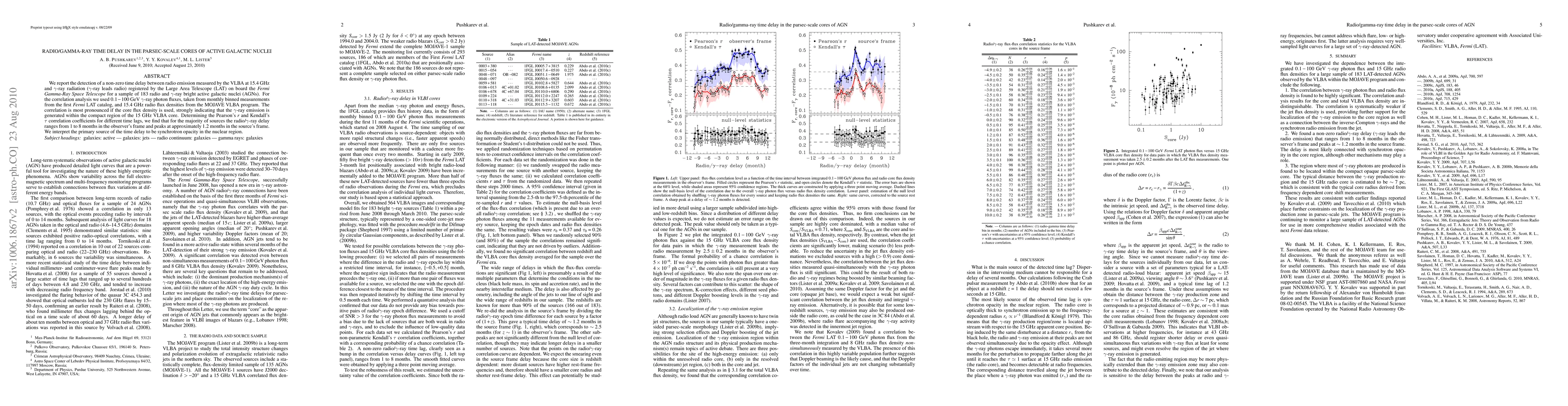This study detected a time delay between radio emissions at 15.4 GHz and gamma-ray radiation in 183 active galactic nuclei, with gamma-rays leading radio signals. The findings suggest that the gamma-ray emission originates within the compact radio core, with delays ranging from 1 to 8 months, likely due to synchrotron opacity in the nuclear region.