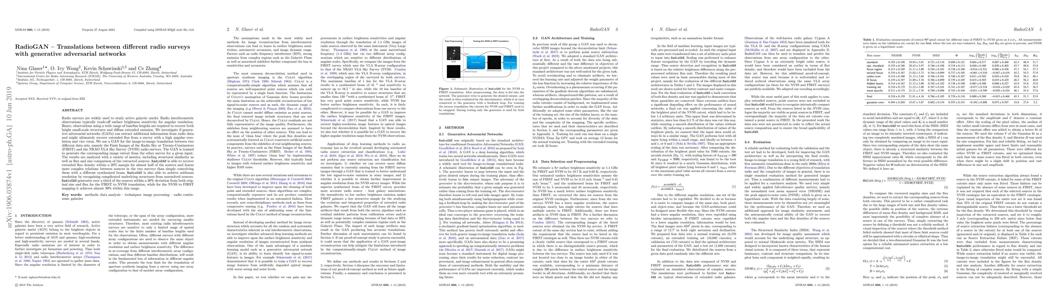 RadioGAN employs generative adversarial networks to translate images between different radio surveys, enabling the recovery of extended flux density and complex source relations. The method shows promising results, achieving subbeam resolution and recovering over a third of sources within a $20\%$ deviation in size and flux.