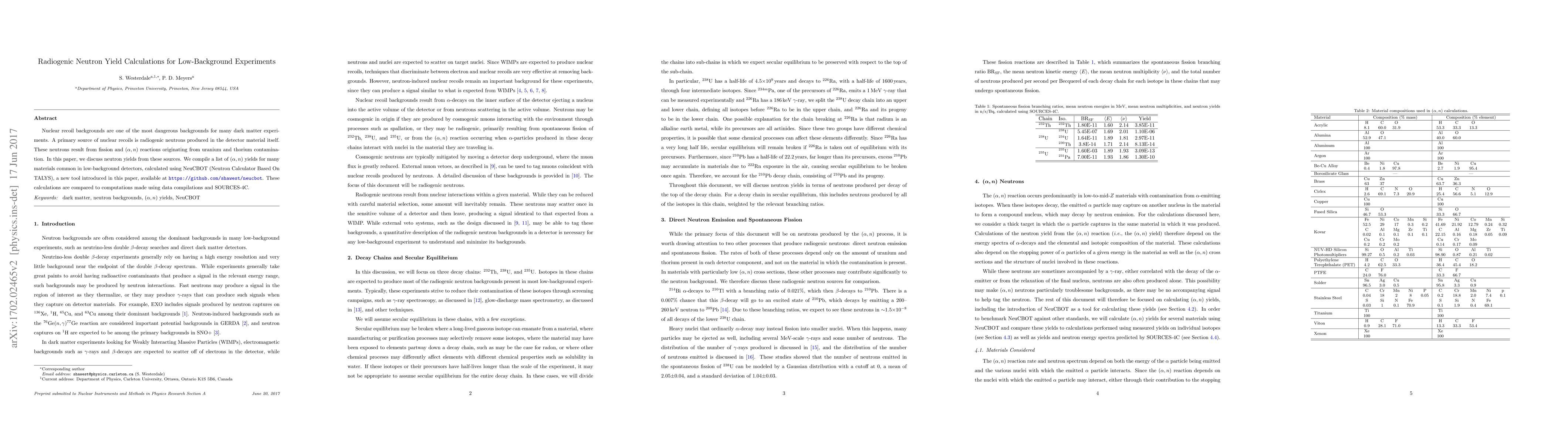 Nuclear recoil backgrounds are one of the most dangerous backgrounds for many dark matter experiments. A primary source of nuclear recoils is radiogenic neutrons produced in the detector material itself. These neutrons result from fission and $(\alpha,n)$ reactions originating from uranium and thorium contamination. In this paper, we discuss neutron yields from these sources. We compile a list of $(\alpha,n)$ yields for many materials common in low-background detectors, calculated using NeuCBOT, a new tool introduced in this paper, available at https://github.com/shawest/neucbot. These calculations are compared to computations made using data compilations and SOURCES-4A
