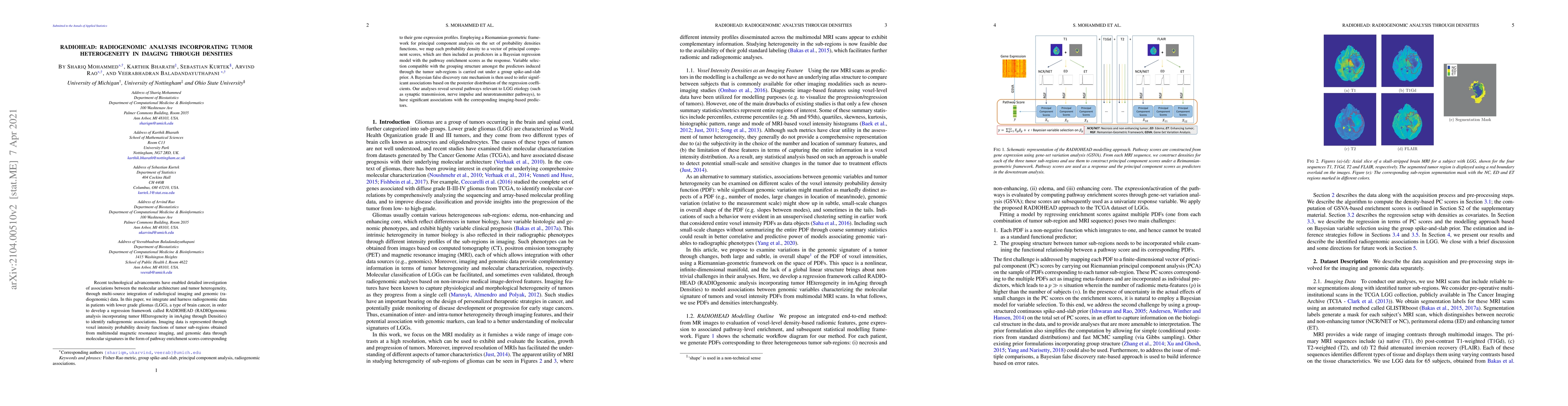 Recent technological advancements have enabled detailed investigation of associations between the molecular architecture and tumor heterogeneity, through multi-source integration of radiological imaging and genomic (radiogenomic) data. In this paper, we integrate and harness radiogenomic data in patients with lower grade gliomas (LGG), a type of brain cancer, in order to develop a regression framework called RADIOHEAD (RADIOgenomic analysis incorporating tumor HEterogeneity in imAging through Densities) to identify radiogenomic associations. Imaging data is represented through voxel intensity probability density functions of tumor sub-regions obtained from multimodal magnetic resonance imaging, and genomic data through molecular signatures in the form of pathway enrichment scores corresponding to their gene expression profiles. Employing a Riemannian-geometric framework for principal component analysis on the set of probability densities functions, we map each probability density to a vector of principal component scores, which are then included as predictors in a Bayesian regression model with the pathway enrichment scores as the response. Variable selection compatible with the grouping structure amongst the predictors induced through the tumor sub-regions is carried out under a group spike-and-slab prior. A Bayesian false discovery rate mechanism is then used to infer significant associations based on the posterior distribution of the regression coefficients. Our analyses reveal several pathways relevant to LGG etiology (such as synaptic transmission, nerve impulse and neurotransmitter pathways), to have significant associations with the corresponding imaging-based predictors.