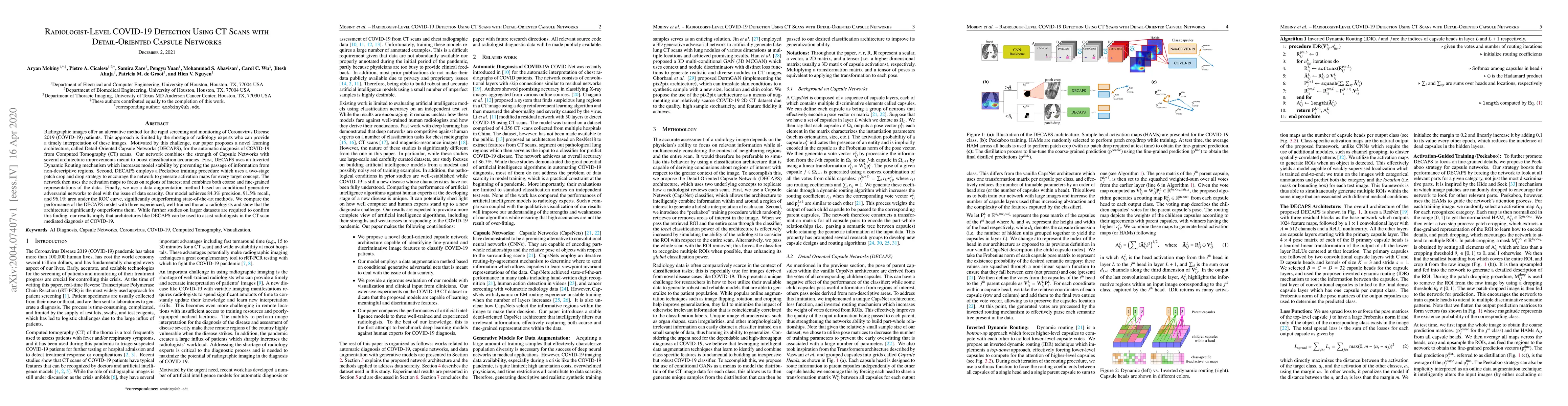 This paper proposes DECAPS, a Detail-Oriented Capsule Network for automatic COVID-19 detection from CT scans, achieving high precision, recall, and ROC curve metrics. The model outperforms radiologists and suggests potential for assisting in rapid CT-based COVID-19 diagnosis despite needing validation on larger datasets.