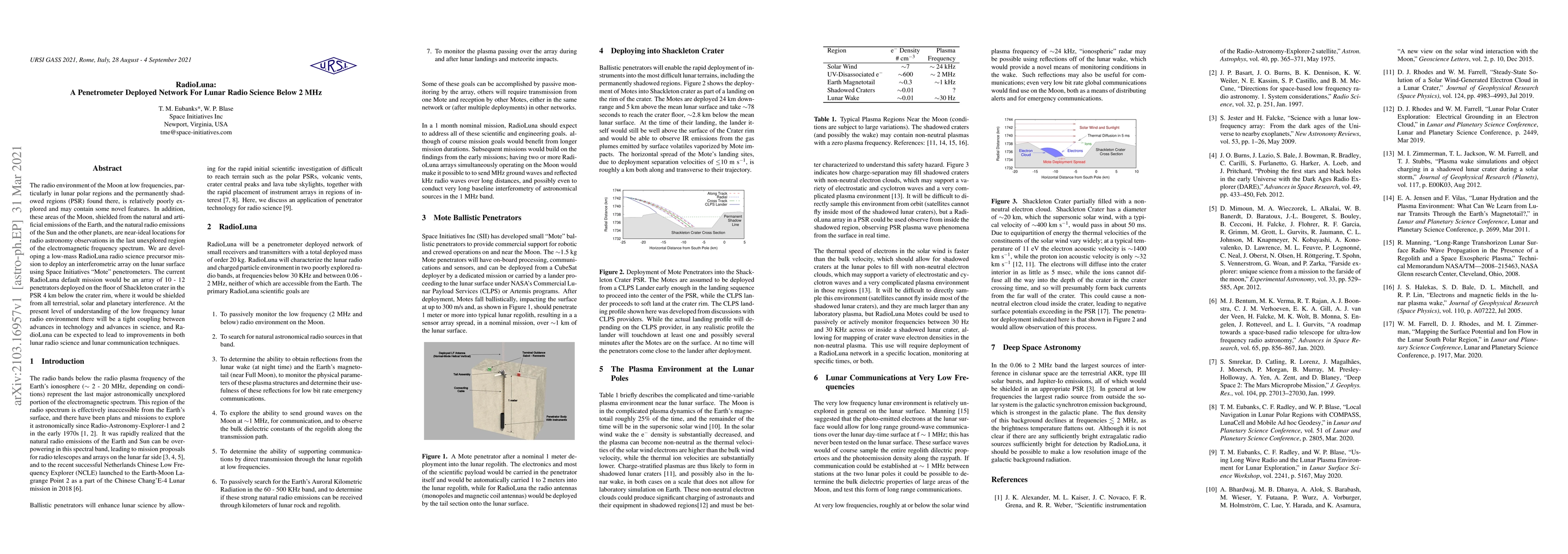 The radio environment of the Moon at low frequencies, particularly in lunar polar regions and the permanently shadowed regions (PSR) found there, is relatively poorly explored and may contain some novel features. In addition, these areas of the Moon, shielded from the natural and artificial emissions of the Earth, and the natural radio emissions of the Sun and the other planets, are near-ideal locations for radio astronomy observations in the last unexplored region of the electromagnetic frequency spectrum. We are developing a low-mass RadioLuna radio science precursor mission to deploy an interferometric array on the lunar surface using Space Initiatives "Mote" penetrometers. The current RadioLuna default mission would be an array of 10 - 12 penetrators deployed on the floor of Shackleton crater in the PSR 4 km below the crater rim, where it would be shielded from all terrestial, solar and planetary interference. At the present level of understanding of the low frequency lunar radio environment there will be a tight coupling between advances in technology and advances in science, and RadioLuna can be expected to lead to improvements in both lunar radio science and lunar communication techniques.