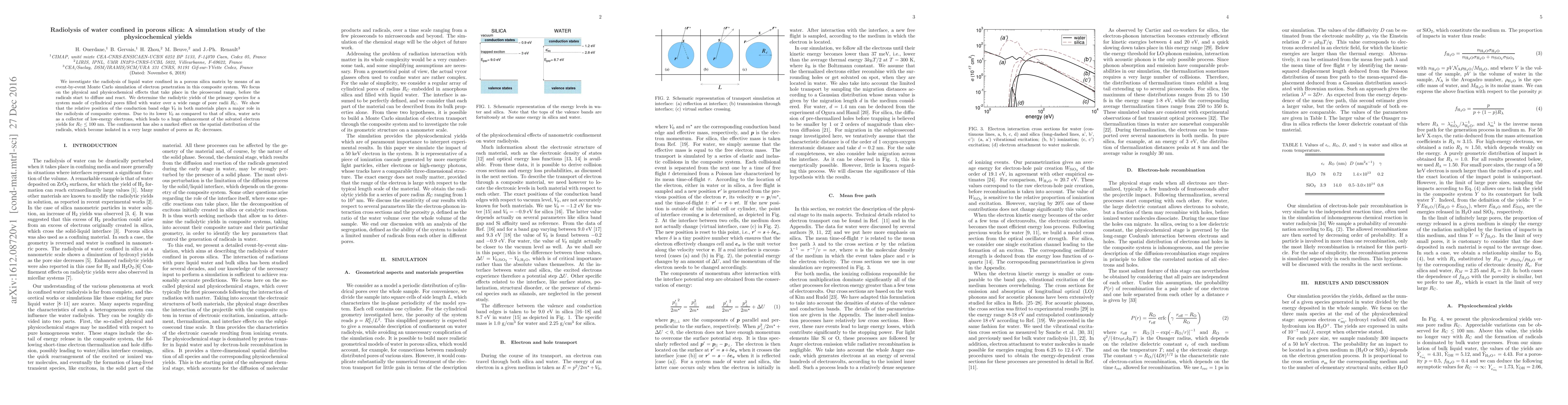 We investigate the radiolysis of liquid water confined in a porous silica matrix by means of an event-by-event Monte Carlo simulation of electron penetration in this composite system. We focus on the physical and physicochemical effects that take place in the picosecond range, before the radicals start to diffuse and react. We determine the radiolytic yields of the primary species for a system made of cylindrical pores filled with water over a wide range of pore radii $R_{\rm C}$. We show that the relative position of the conduction band edge $V_0$ in both materials plays a major role in the radiolysis of composite systems. Due to its lower $V_0$ as compared to that of silica, water acts as a collector of low-energy electrons, which leads to a huge enhancement of the solvated electron yields for $R_{\rm C} \leq$ 100 nm. The confinement has also a marked effect on the spatial distribution of the radicals, which become isolated in a very large number of pores as $R_{\rm C}$ decreases.