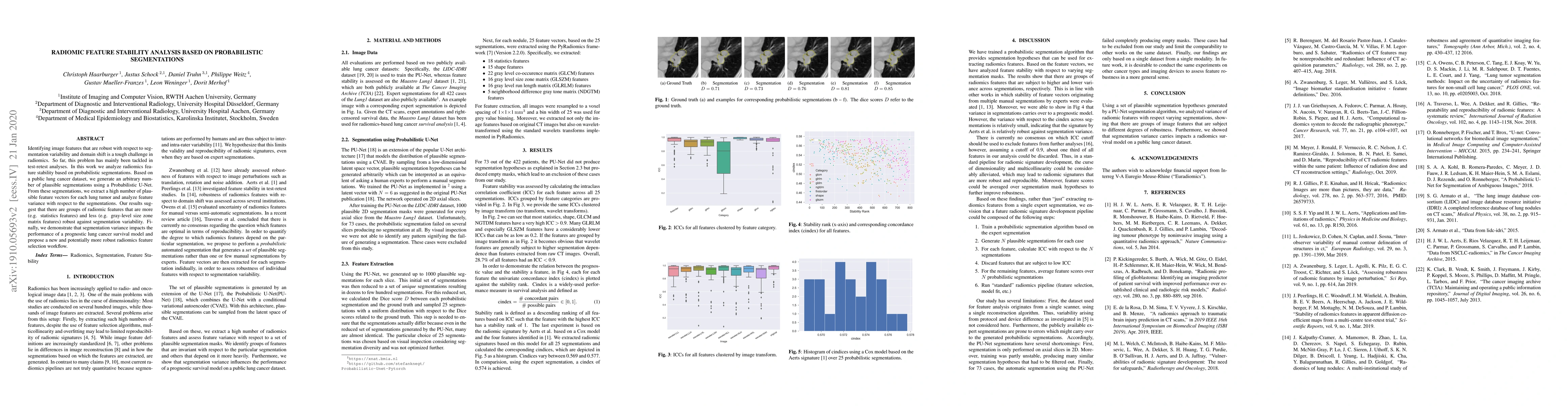 Identifying image features that are robust with respect to segmentation variability and domain shift is a tough challenge in radiomics. So far, this problem has mainly been tackled in test-retest analyses. In this work we analyze radiomics feature stability based on probabilistic segmentations. Based on a public lung cancer dataset, we generate an arbitrary number of plausible segmentations using a Probabilistic U-Net. From these segmentations, we extract a high number of plausible feature vectors for each lung tumor and analyze feature variance with respect to the segmentations. Our results suggest that there are groups of radiomic features that are more (e.g. statistics features) and less (e.g. gray-level size zone matrix features) robust against segmentation variability. Finally, we demonstrate that segmentation variance impacts the performance of a prognostic lung cancer survival model and propose a new and potentially more robust radiomics feature selection workflow.