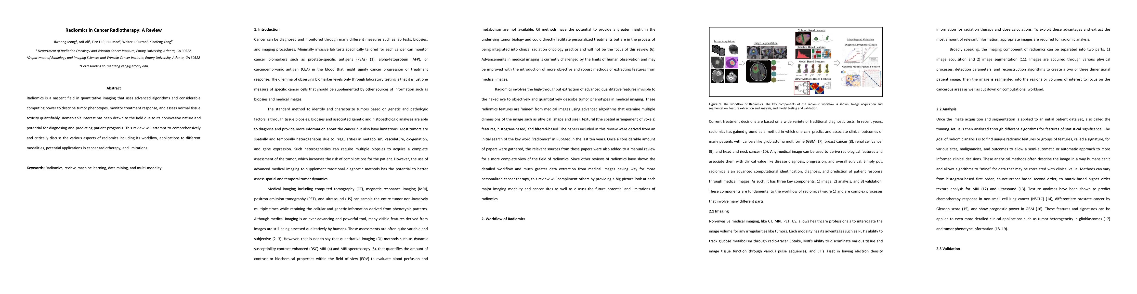 Radiomics is a nascent field in quantitative imaging that uses advanced algorithms and considerable computing power to describe tumor phenotypes, monitor treatment response, and assess normal tissue toxicity quantifiably. Remarkable interest has been drawn to the field due to its noninvasive nature and potential for diagnosing and predicting patient prognosis. This review will attempt to comprehensively and critically discuss the various aspects of radiomics including its workflow, applications to different modalities, potential applications in cancer radiotherapy, and limitations.