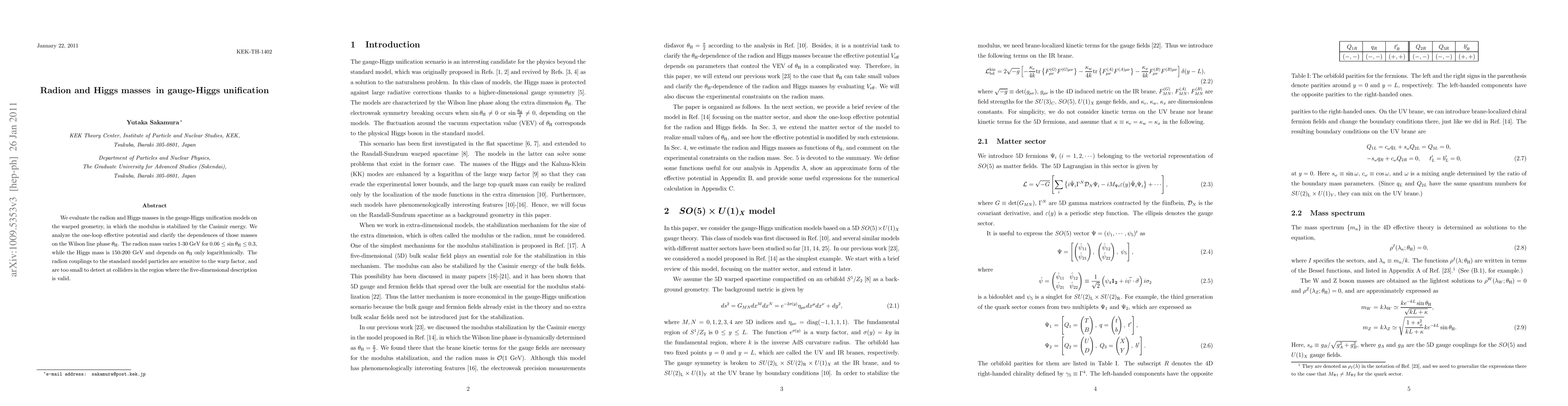 This paper evaluates radion and Higgs masses in gauge-Higgs unification models on warped geometry, finding radion masses between 1-30 GeV and Higgs masses between 150-200 GeV, both dependent on the Wilson line phase $\theta_H$. The radion's weak coupling to standard model particles makes it undetectable at colliders.