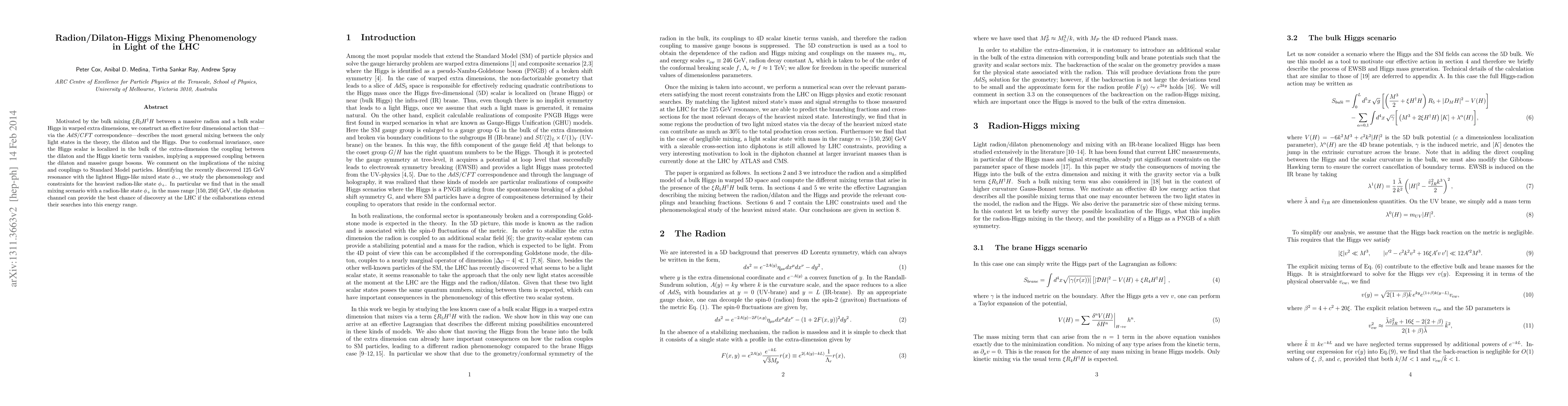 Motivated by the bulk mixing $\xi R_5 H^{\dagger}H$ between a massive radion and a bulk scalar Higgs in warped extra dimensions, we construct an effective four dimensional action that---via the AdS/CFT correspondence---describes the most general mixing between the only light states in the theory, the dilaton and the Higgs. Due to conformal invariance, once the Higgs scalar is localized in the bulk of the extra-dimension the coupling between the dilaton and the Higgs kinetic term vanishes, implying a suppressed coupling between the dilaton and massive gauge bosons. We comment on the implications of the mixing and couplings to Standard Model particles. Identifying the recently discovered 125 GeV resonance with the lightest Higgs-like mixed state $\phi_{-}$, we study the phenomenology and constraints for the heaviest radion-like state $\phi_{+}$. In particular we find that in the small mixing scenario with a radion-like state $\phi_{+}$ in the mass range [150,250] GeV, the diphoton channel can provide the best chance of discovery at the LHC if the collaborations extend their searches into this energy range.