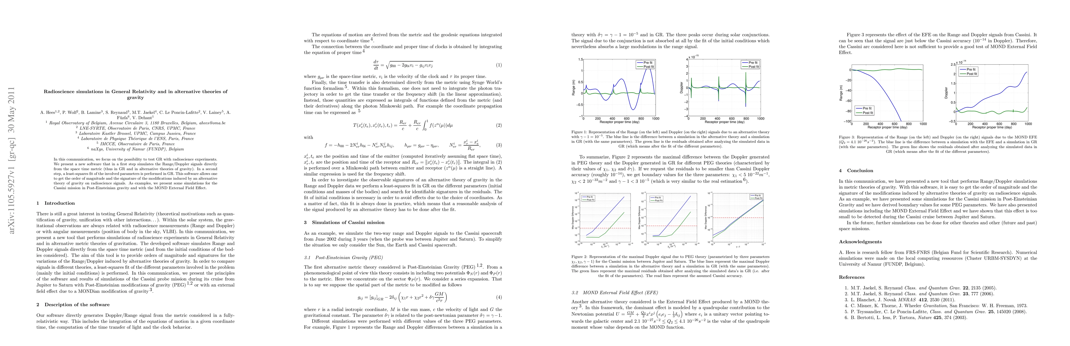 In this communication, we focus on the possibility to test GR with radioscience experiments. We present a new software that in a first step simulates the Range/Doppler signals directly from the space time metric (thus in GR and in alternative theories of gravity). In a second step, a least-squares fit of the involved parameters is performed in GR. This software allows one to get the order of magnitude and the signature of the modifications induced by an alternative theory of gravity on radioscience signals. As examples, we present some simulations for the Cassini mission in Post-Einsteinian gravity and with the MOND External Field Effect.
