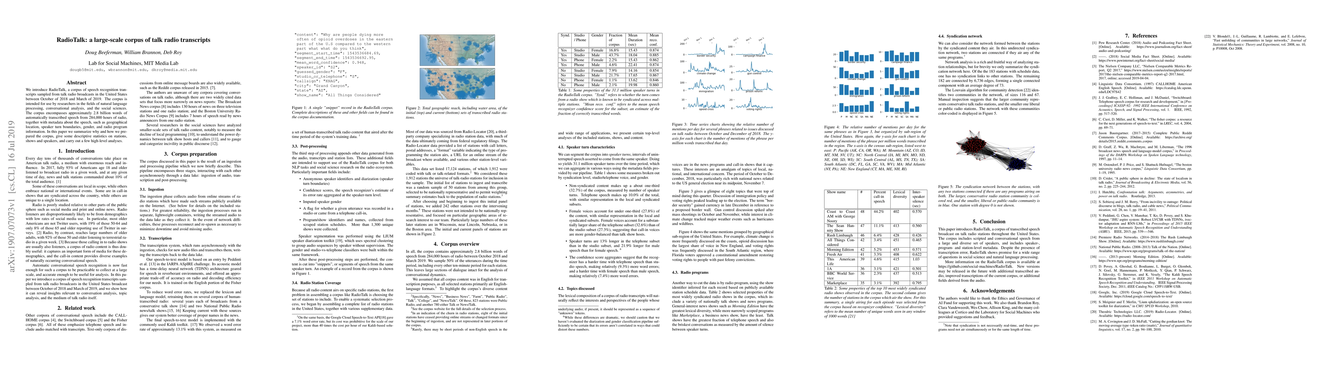 RadioTalk is a large corpus of 2.8 billion words from U.S. talk radio transcripts, collected from 2018-2019, intended for NLP, conversational analysis, and social science research, featuring metadata on location, speaker turns, and program details. The paper discusses its preparation and provides initial analyses.