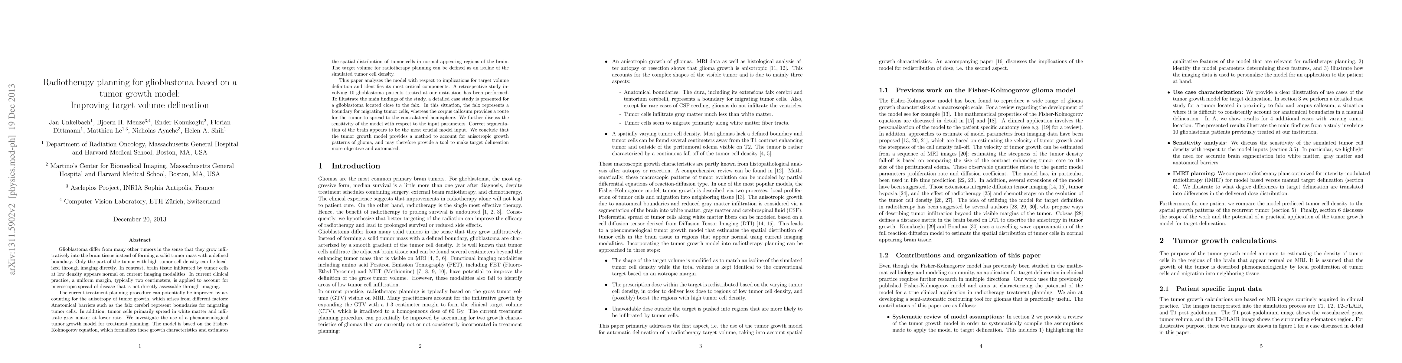 Glioblastoma are known to infiltrate the brain parenchyma instead of forming a solid tumor mass with a defined boundary. Only the part of the tumor with high tumor cell density can be localized through imaging directly. In contrast, brain tissue infiltrated by tumor cells at low density appears normal on current imaging modalities. In clinical practice, a uniform margin is applied to account for microscopic spread of disease. The current treatment planning procedure can potentially be improved by accounting for the anisotropy of tumor growth: Anatomical barriers such as the falx cerebri represent boundaries for migrating tumor cells. In addition, tumor cells primarily spread in white matter and infiltrate gray matter at lower rate. We investigate the use of a phenomenological tumor growth model for treatment planning. The model is based on the Fisher-Kolmogorov equation, which formalizes these growth characteristics and estimates the spatial distribution of tumor cells in normal appearing regions of the brain. The target volume for radiotherapy planning can be defined as an isoline of the simulated tumor cell density. A retrospective study involving 10 glioblastoma patients has been performed. To illustrate the main findings of the study, a detailed case study is presented for a glioblastoma located close to the falx. In this situation, the falx represents a boundary for migrating tumor cells, whereas the corpus callosum provides a route for the tumor to spread to the contralateral hemisphere. We further discuss the sensitivity of the model with respect to the input parameters. Correct segmentation of the brain appears to be the most crucial model input. We conclude that the tumor growth model provides a method to account for anisotropic growth patterns of glioblastoma, and may therefore provide a tool to make target delineation more objective and automated.