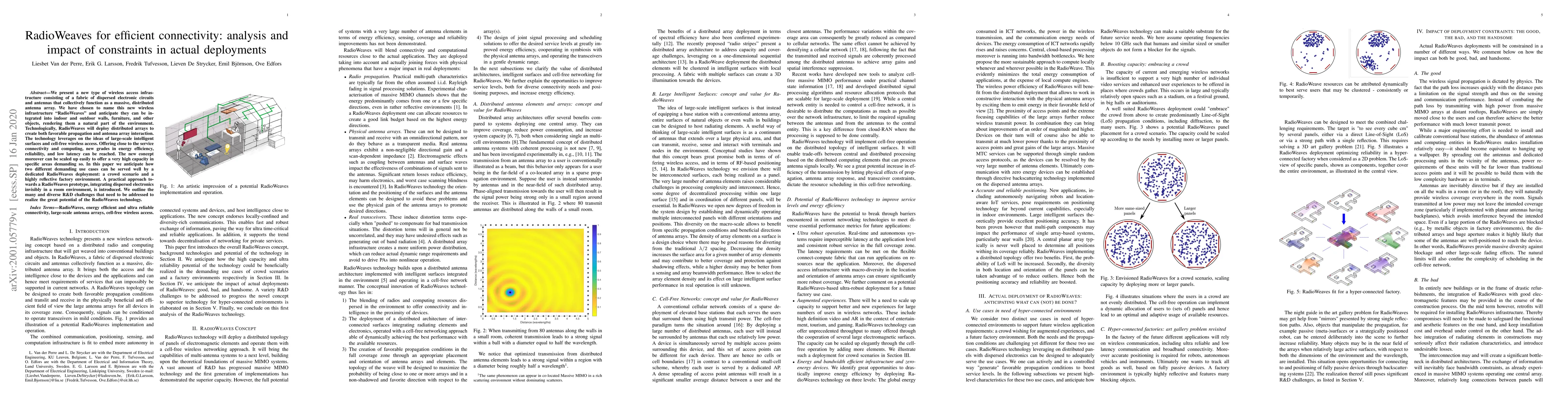 This paper introduces RadioWeaves, a novel wireless infrastructure using dispersed electronic circuits and antennas to form a massive distributed antenna array, aiming for high connectivity, energy efficiency, and scalability. The study explores its potential in crowd scenarios and reflective factory environments, while also discussing the R&D challenges for practical deployment.