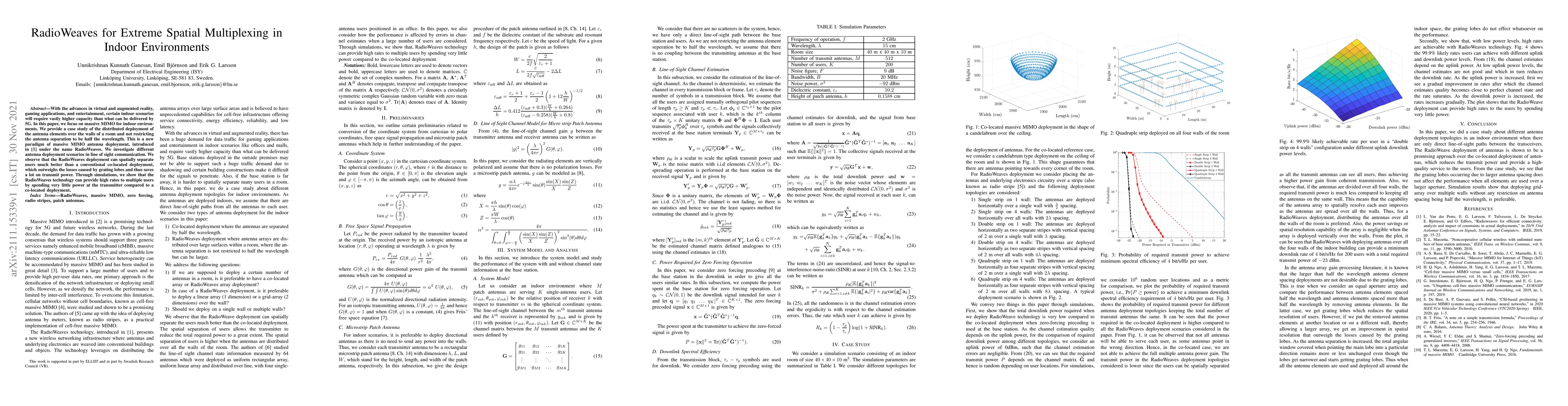 With the advances in virtual and augmented reality, gaming applications, and entertainment, certain indoor scenarios will require vastly higher capacity than what can be delivered by 5G. In this paper, we focus on massive MIMO for indoor environments. We provide a case study of the distributed deployment of the antenna elements over the walls of a room and not restricting the antenna separation to be half the wavelength. This is a new paradigm of massive MIMO antenna deployment, introduced under the name RadioWeaves. We investigate different antenna deployment scenarios in line of sight communication. We observe that the RadioWeaves deployment can spatially separate users much better than a conventional co-located deployment, which outweighs the losses caused by grating lobes and thus saves a lot on transmit power. Through simulations, we show that the RadioWeaves technology can provide high rates to multiple users by spending very little power at the transmitter compared to a co-located deployment.
