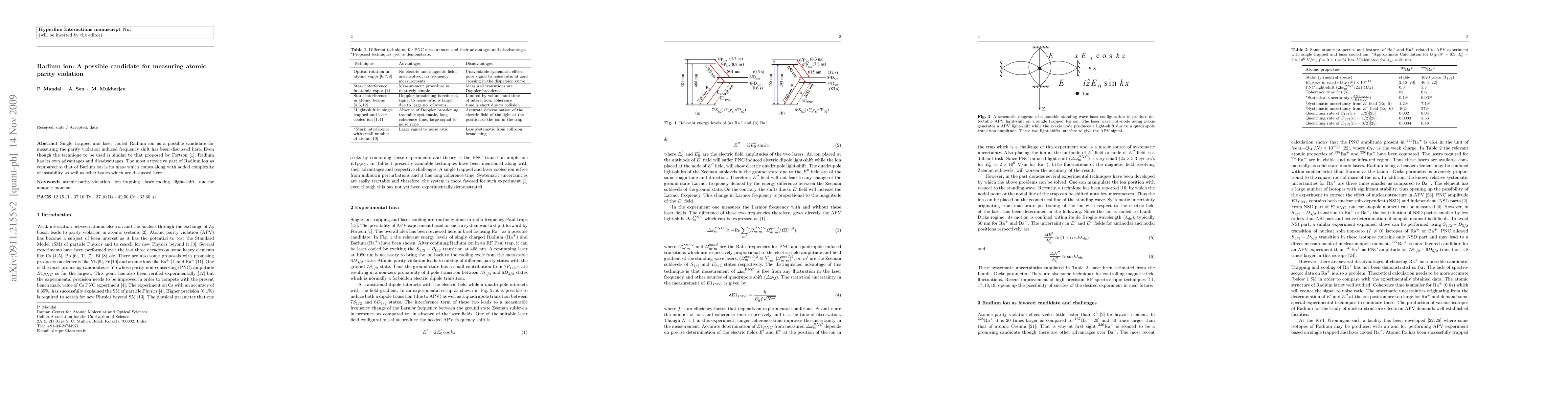 Single trapped and laser cooled Radium ion as a possible candidate for measuring the parity violation induced frequency shift has been discussed here. Even though the technique to be used is similar to that proposed by Fortson [1], Radium has its own advantages and disadvantages. The most attractive part of Radium ion as compared to that of Barium ion is its mass which comes along with added complexity of instability as well as other issues which are discussed here