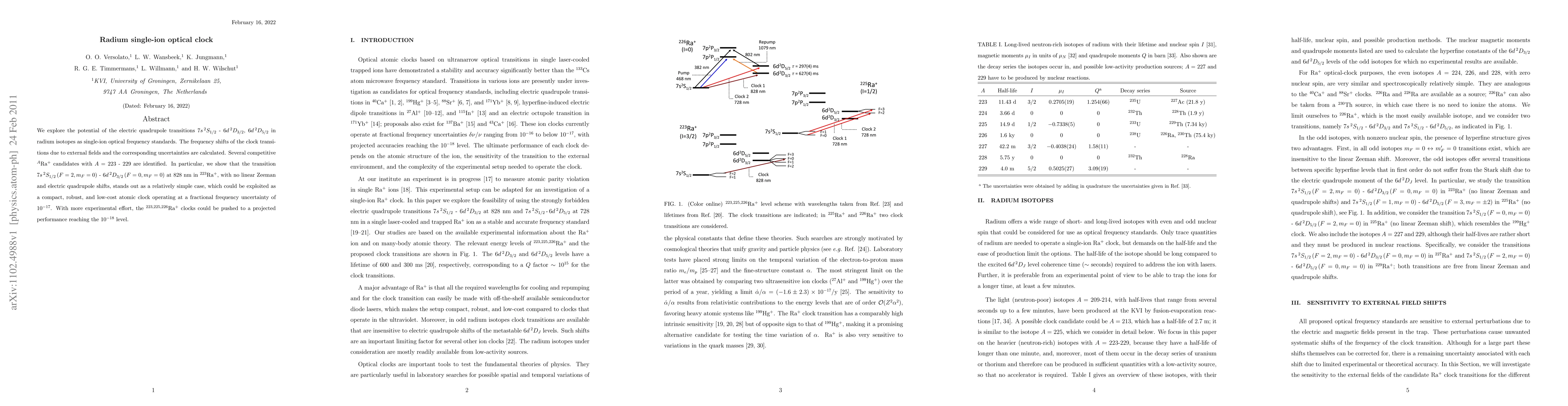 This paper investigates radium isotopes for single-ion optical clocks, focusing on electric quadrupole transitions. The transition $7s\,^2S_{1/2}\,(F=2,m_F=0)$ to $6d\,^2D_{3/2}\,(F=0,m_F=0)$ in $^{223}$Ra$^+$ is highlighted for its potential as a compact, robust, and low-cost atomic clock with a fractional frequency uncertainty of $10^{-17}$.