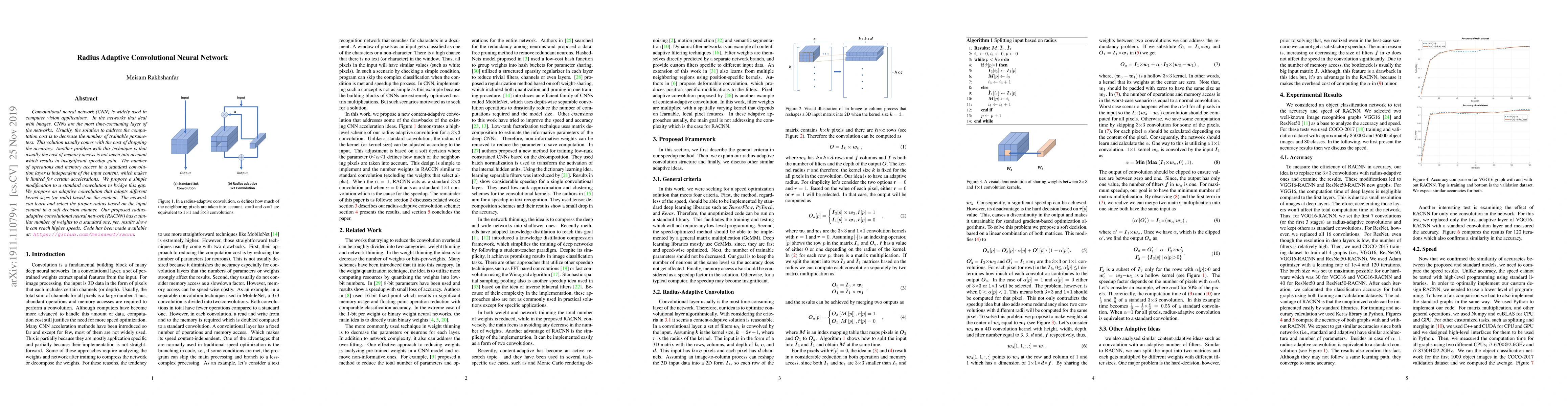Convolutional neural network (CNN) is widely used in computer vision applications. In the networks that deal with images, CNNs are the most time-consuming layer of the networks. Usually, the solution to address the computation cost is to decrease the number of trainable parameters. This solution usually comes with the cost of dropping the accuracy. Another problem with this technique is that usually the cost of memory access is not taken into account which results in insignificant speedup gain. The number of operations and memory access in a standard convolution layer is independent of the input content, which makes it limited for certain accelerations. We propose a simple modification to a standard convolution to bridge this gap. We propose an adaptive convolution that adopts different kernel sizes (or radii) based on the content. The network can learn and select the proper radius based on the input content in a soft decision manner. Our proposed radius-adaptive convolutional neural network (RACNN) has a similar number of weights to a standard one, yet, results show it can reach higher speeds. The code has been made available at: https://github.com/meisamrf/racnn.