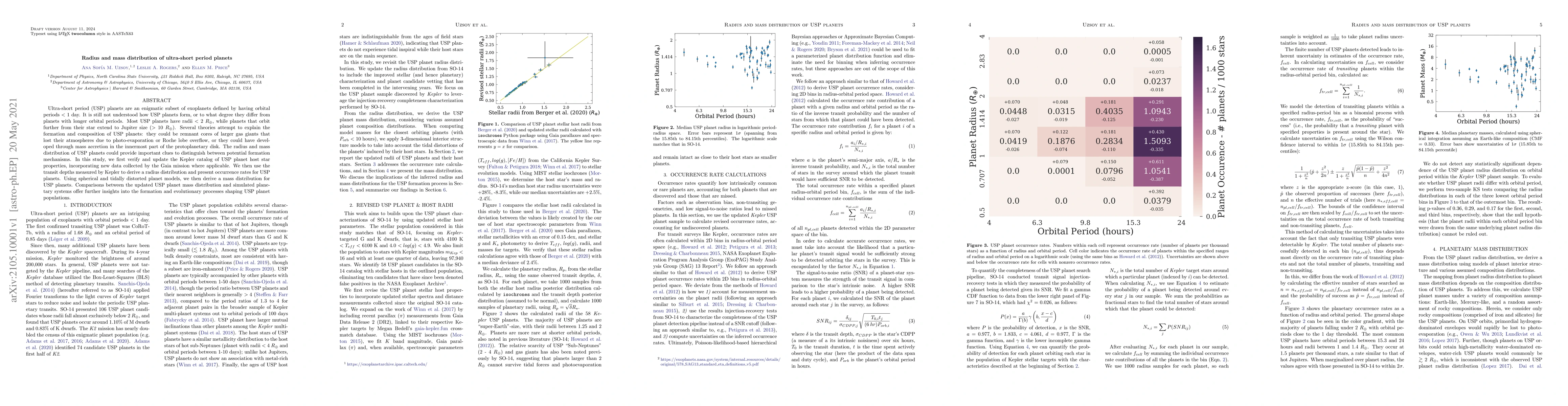 Ultra-short period (USP) planets are an enigmatic subset of exoplanets defined by having orbital periods $<$ 1 day. It is still not understood how USP planets form, or to what degree they differ from planets with longer orbital periods. Most USP planets have radii $<$ 2 $R_{\oplus}$, while planets that orbit further from their star extend to Jupiter size ($>$ 10 $R_{\oplus}$). Several theories attempt to explain the formation and composition of USP planets: they could be remnant cores of larger gas giants that lost their atmospheres due to photo-evaporation or Roche lobe overflow, or they could have developed through mass accretion in the innermost part of the protoplanetary disk. The radius and mass distribution of USP planets could provide important clues to distinguish between potential formation mechanisms. In this study, we first verify and update the Kepler catalog of USP planet host star properties, incorporating new data collected by the Gaia mission where applicable. We then use the transit depths measured by Kepler to derive a radius distribution and present occurrence rates for USP planets. Using spherical and tidally distorted planet models, we then derive a mass distribution for USP planets. Comparisons between the updated USP planet mass distribution and simulated planetary systems offer further insights into the formation and evolutionary processes shaping USP planet populations.