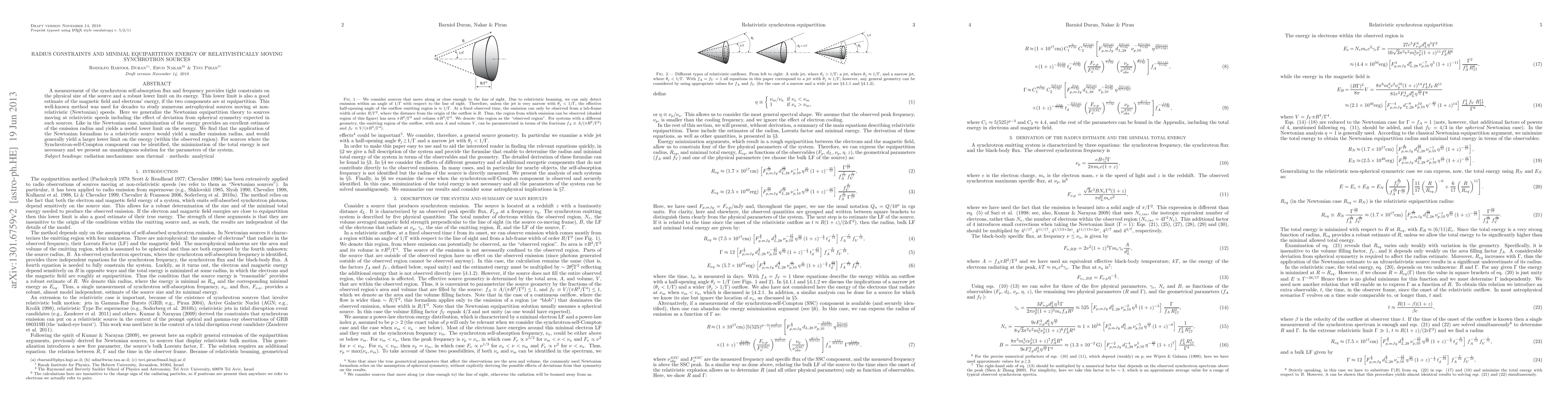 A measurement of the synchrotron self-absorption flux and frequency provides tight constraints on the physical size of the source and a robust lower limit on its energy. This lower limit is also a good estimate of the magnetic field and electrons' energy, if the two components are at equipartition. This well-known method was used for decades to study numerous astrophysical sources moving at non-relativistic (Newtonian) speeds. Here we generalize the Newtonian equipartition theory to sources moving at relativistic speeds including the effect of deviation from spherical symmetry expected in such sources. Like in the Newtonian case, minimization of the energy provides an excellent estimate of the emission radius and yields a useful lower limit on the energy. We find that the application of the Newtonian formalism to a relativistic source would yield a smaller emission radius, and would generally yield a larger lower limit on the energy (within the observed region). For sources where the Synchrotron-self-Compton component can be identified, the minimization of the total energy is not necessary and we present an unambiguous solution for the parameters of the system.