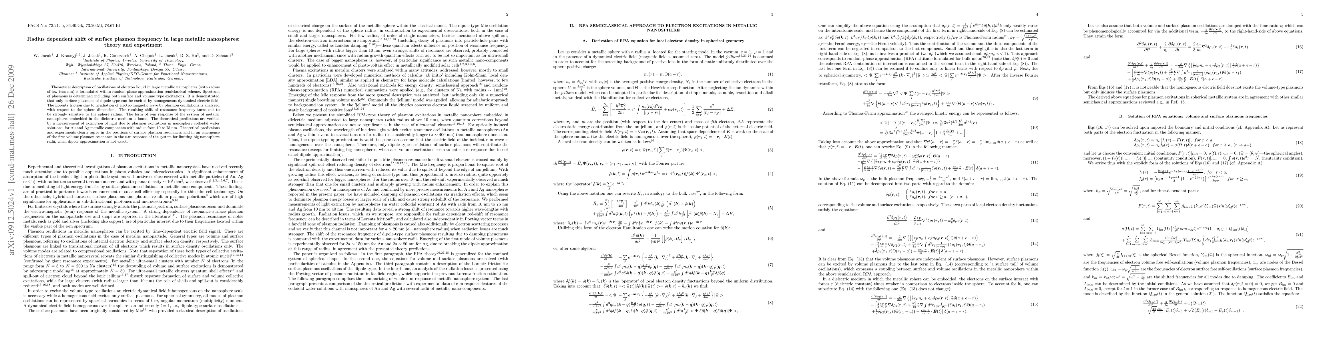 This paper presents a theoretical model for the radius-dependent shift in surface plasmon frequency in large metallic nanospheres, validated by experimental measurements of light extinction in colloidal solutions of Au and Ag nanospheres. The model accurately predicts the resonance frequency shift and the emergence of volume plasmon resonances as nanosphere size increases.