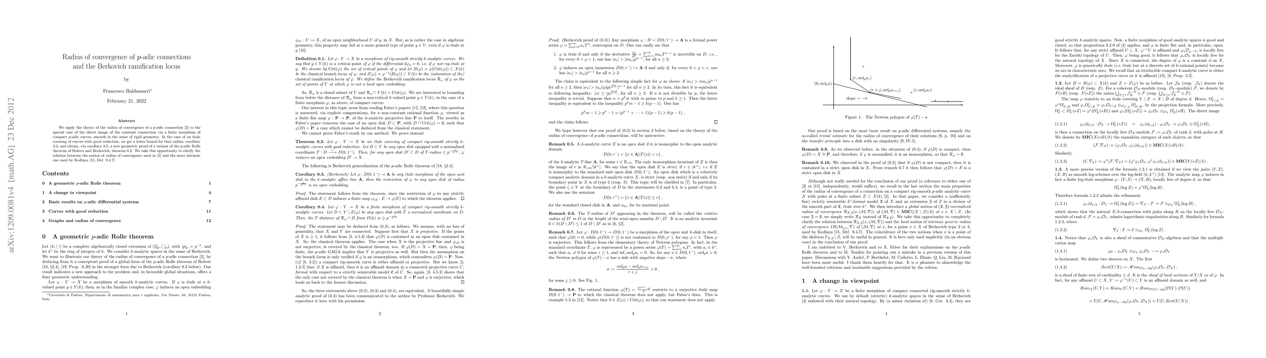 We apply the theory of the radius of convergence of a p-adic connection to the special case of the direct image of the constant connection via a finite morphism of compact p-adic curves, smooth in the sense of rigid geometry. In the case of an etale covering of curves with good reduction, we get a lower bound for that radius and obtain a new geometric proof of a variant of the p-adic Rolle theorem of Robert and Berkovich. We take this opportunity to clarify the relation between our notion of radius of convergencand the more intrinsic one used by Kedlaya
