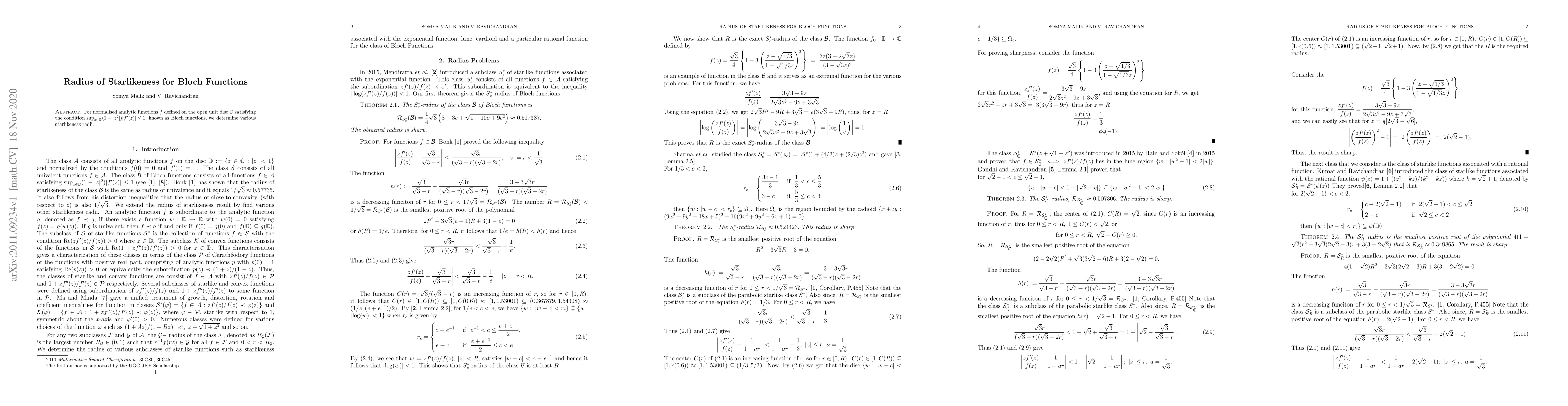 This paper investigates the radius of starlikeness for Bloch functions, determining the maximum value of $r$ for which a normalized analytic function $f$ remains starlike when defined on the open unit disc $\mathbb{D}$ under the given condition.