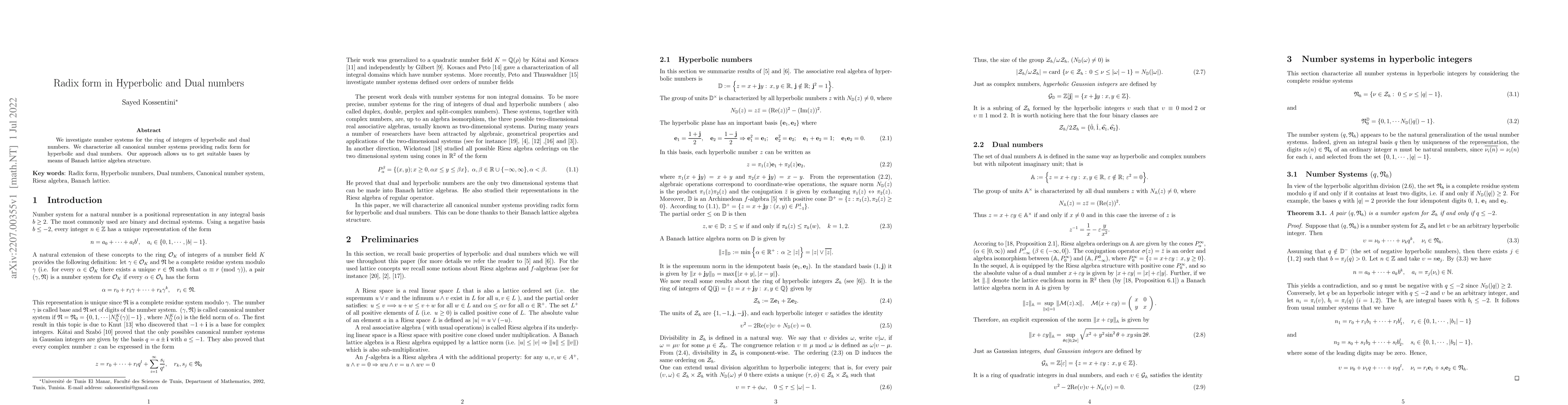 Summary: This paper explores number systems for hyperbolic and dual numbers, identifying all canonical radix forms. It leverages Banach lattice algebra structure to derive appropriate bases for these number systems.