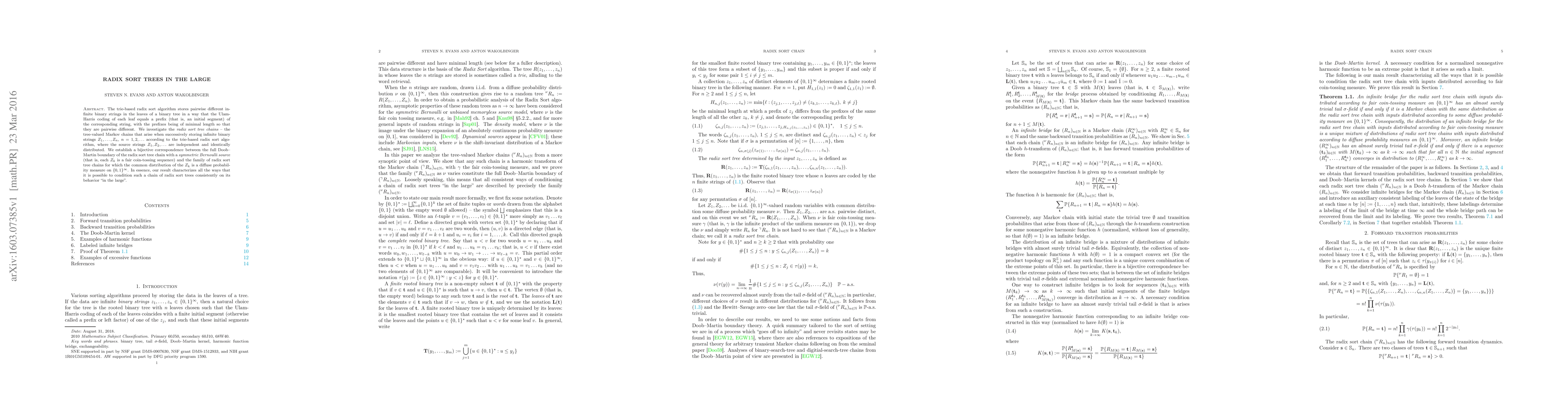This paper explores radix sort trees, specifically focusing on trie-based radix sort algorithms for storing infinite binary strings. It establishes a connection between the full Doob-Martin boundary of radix sort tree chains and symmetric Bernoulli sources, characterizing the consistent conditioning of these chains based on their long-term behavior.