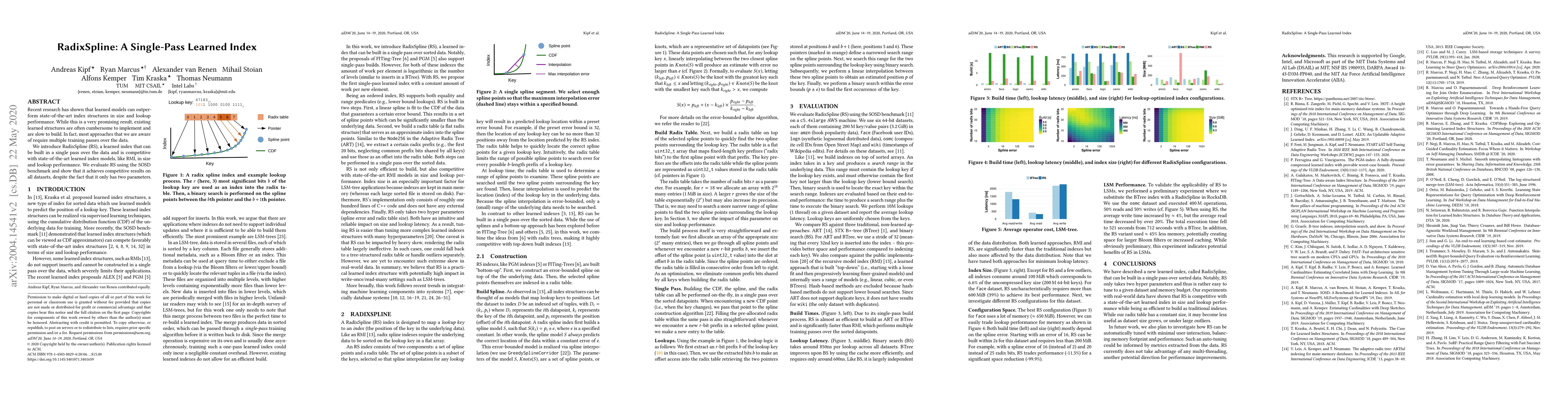 RadixSpline (RS) is a single-pass learned index that competes with state-of-the-art models in size and lookup performance while requiring only one training pass over the data, unlike most existing methods that need multiple passes. Evaluated on the SOSD benchmark, RS demonstrates competitive results across datasets with just two parameters.