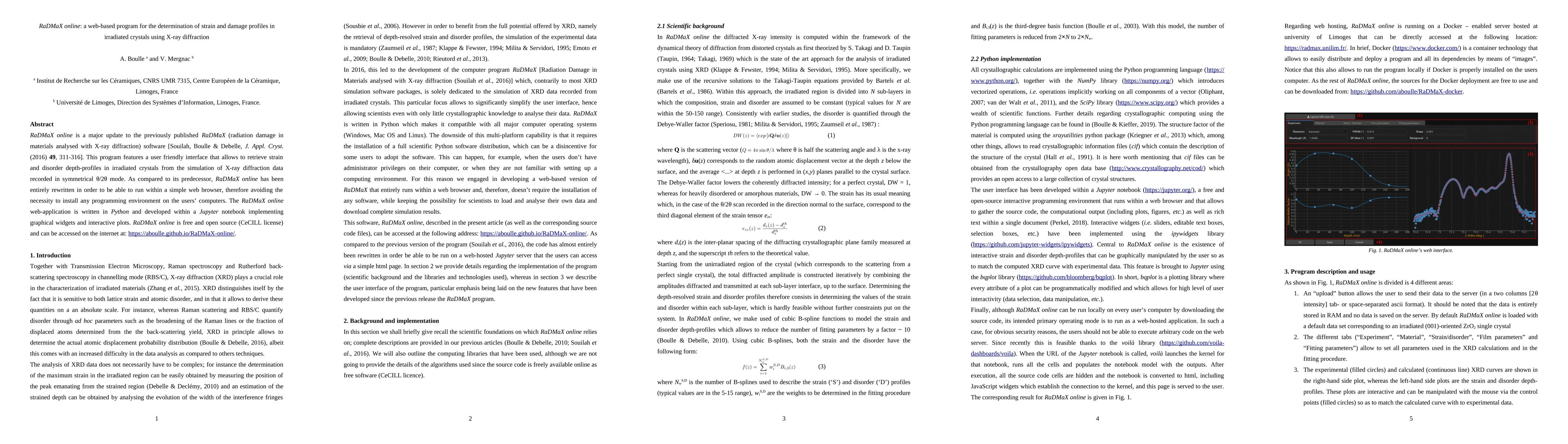 RaDMaX online is a web-based update of the RaDMaX software for determining strain and damage profiles in irradiated crystals using X-ray diffraction. It offers a user-friendly interface for retrieving depth-profiles from X-ray diffraction data without requiring any local software installation.