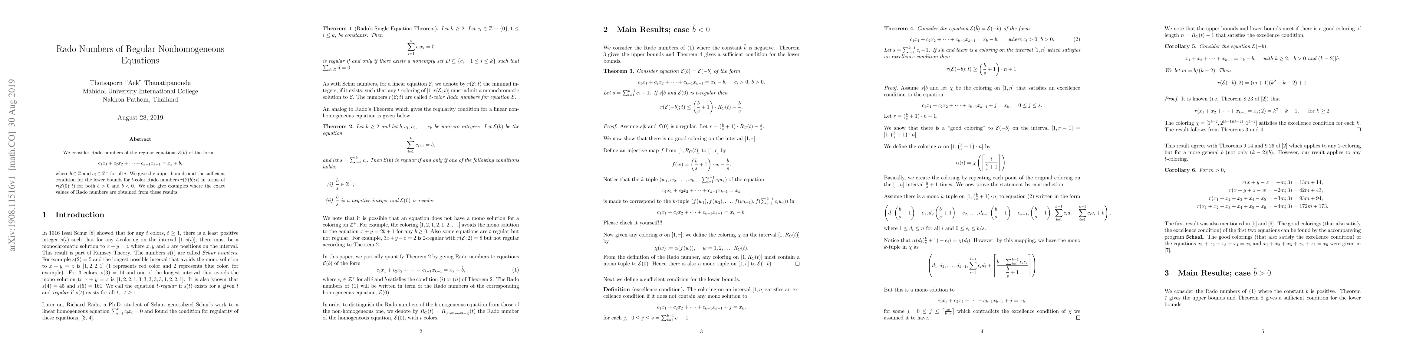 This research paper investigates Rado numbers for specific forms of regular nonhomogeneous equations, providing upper and lower bounds for t-color Rado numbers in terms of r(E(0);t). It offers examples illustrating exact Rado number values for both positive and negative integers b, contributing to understanding the behavior of these equations in different scenarios.