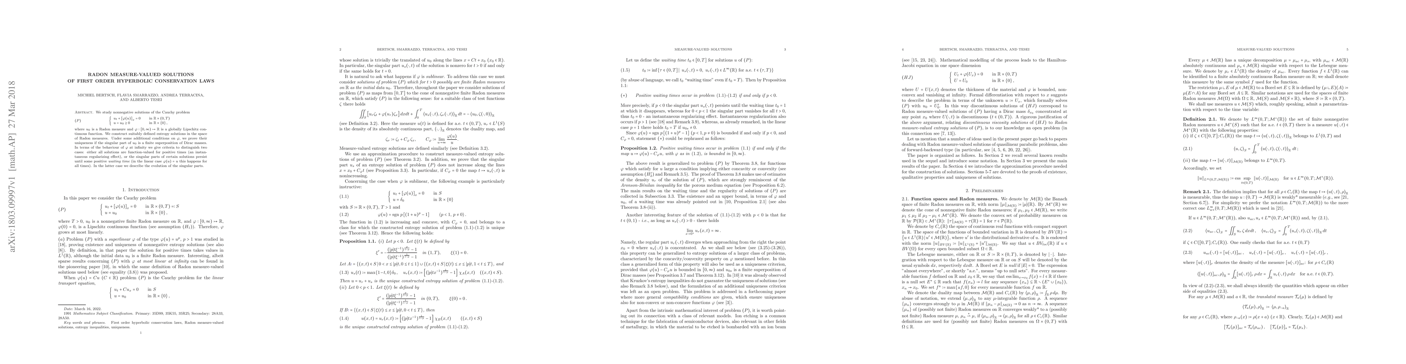 This paper studies nonnegative solutions to a first-order hyperbolic conservation law with Radon measure-valued initial conditions, constructing entropy solutions and proving their uniqueness under certain conditions. It also explores the behavior of these solutions at infinity.
