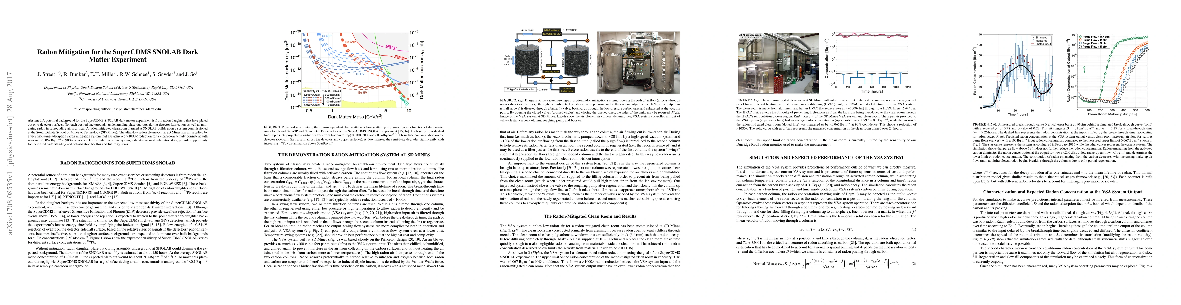 This paper discusses the implementation of radon mitigation techniques to reduce background noise in the SuperCDMS SNOLAB dark matter experiment, focusing on the plate-out of radon daughters and the effectiveness of a vacuum-swing-adsorption system used in a cleanroom at SD Mines. The system achieved a significant reduction in radon levels, providing a model for future radon mitigation efforts.