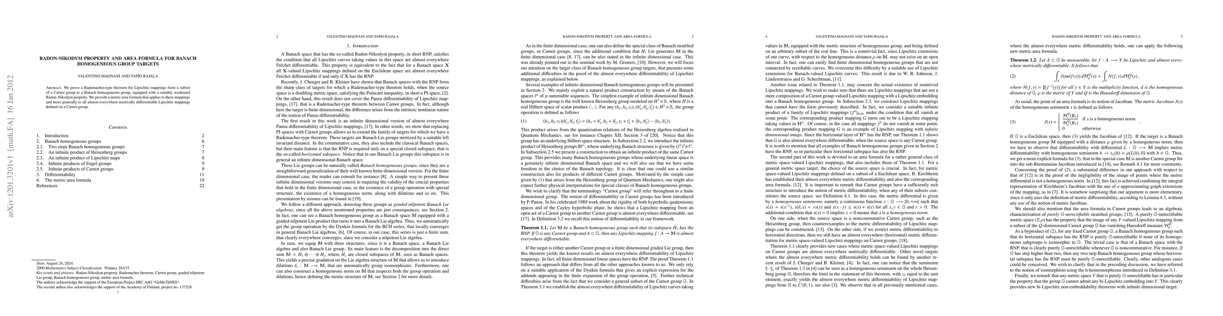 Summary: This paper establishes a Rademacher-type theorem for Lipschitz mappings in Banach homogeneous groups and introduces a metric area formula applicable to these mappings and all almost everywhere metrically differentiable Lipschitz mappings on Carnot groups.