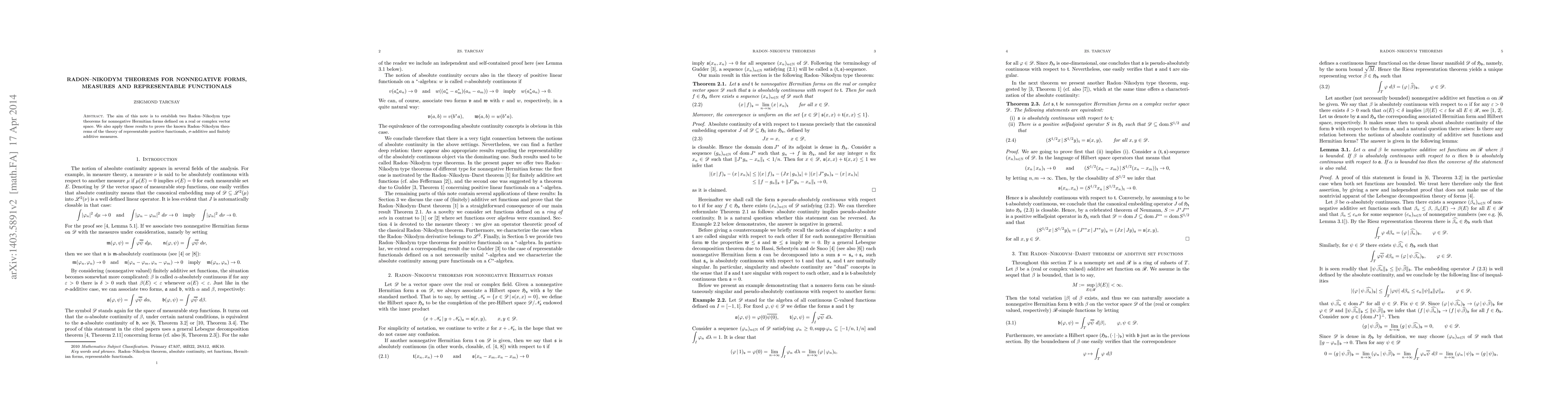 This paper establishes two Radon-Nikodym type theorems for nonnegative Hermitian forms on vector spaces and applies these results to prove classical Radon-Nikodym theorems for representable positive functionals and measures.