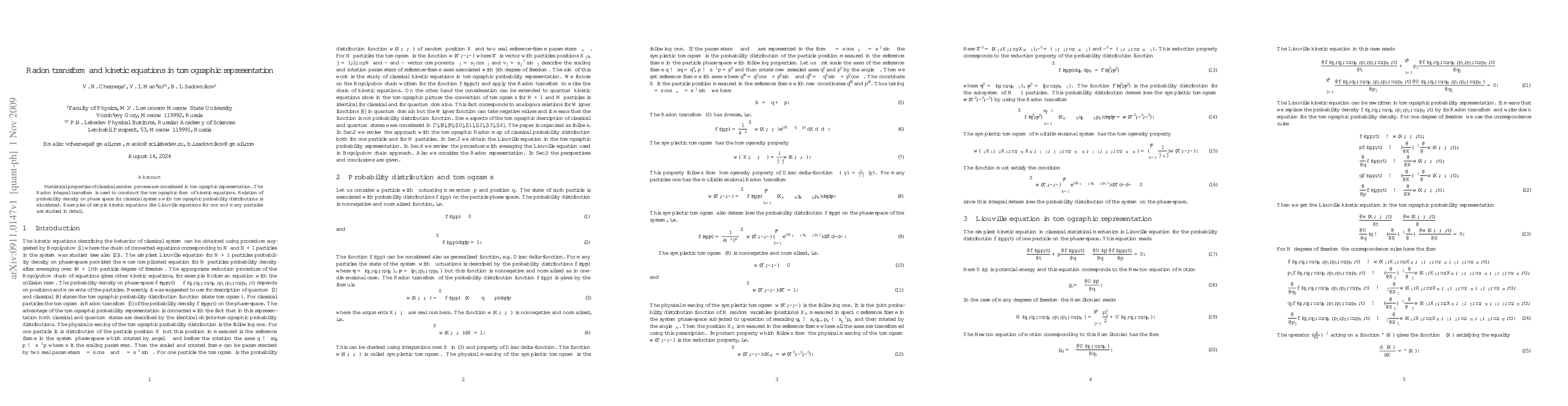 This paper explores the statistical properties of classical random processes using the Radon transform to derive tomographic forms of kinetic equations, elucidating the connection between phase space probability densities and tomographic distributions, and examines simple kinetic equations such as Liouville equations for both single and multiple particles.