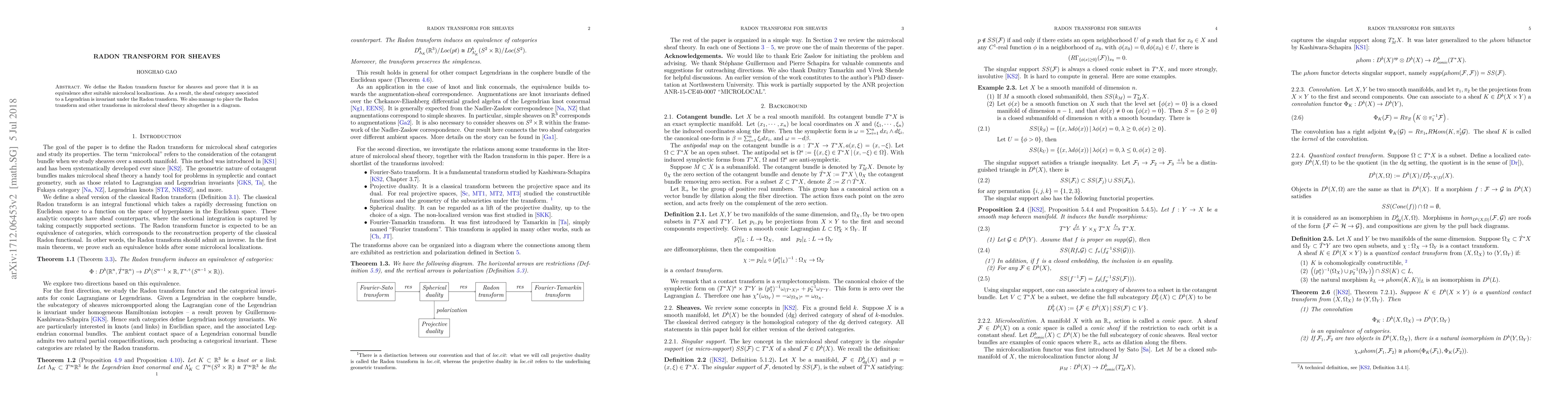 Summary: The paper defines a Radon transform functor for sheaves and proves its equivalence under microlocal localizations, demonstrating the invariance of associated sheaf categories to Legendrians under the Radon transform, and organizes various transforms within microlocal sheaf theory in a comprehensive diagram.