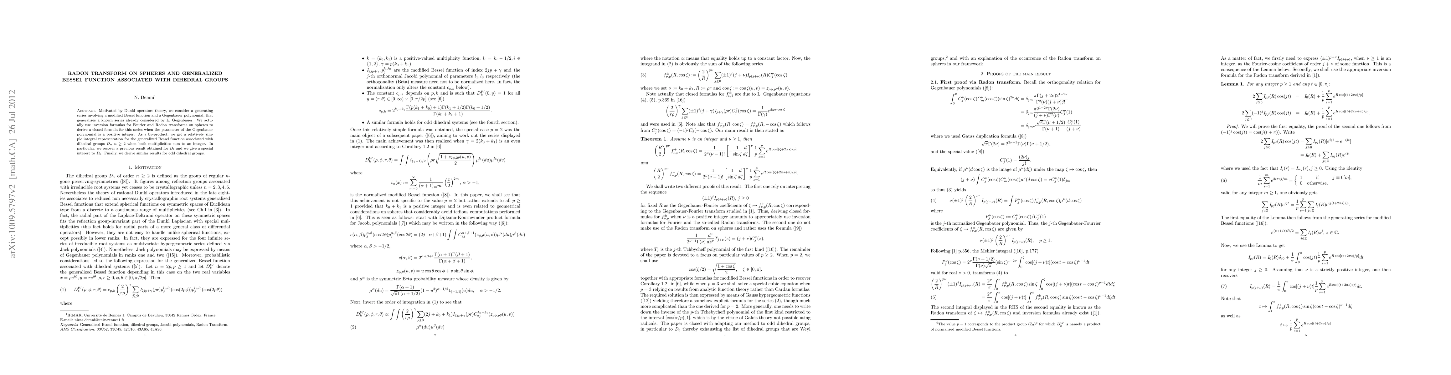 Motivated by Dunkl operators theory, we consider a generating series involving a modified Bessel function and a Gegenbauer polynomial, that generalizes a known series already considered by L. Gegenbauer. We actually use inversion formulas for Fourier and Radon transforms to derive a closed formula for this series when the parameter of the Gegenbauer polynomial is a strictly positive integer. As a by-product, we get a relatively simple integral representation for the generalized Bessel function associated with even dihedral groups when both multiplicities sum to an integer. In particular, we recover a previous result obtained for the square symmetries-preserving group and we give a special interest to the hexagon. The paper is closed with adapting our method to odd dihedral groups thereby exhausting the list of Weyl dihedral groups.