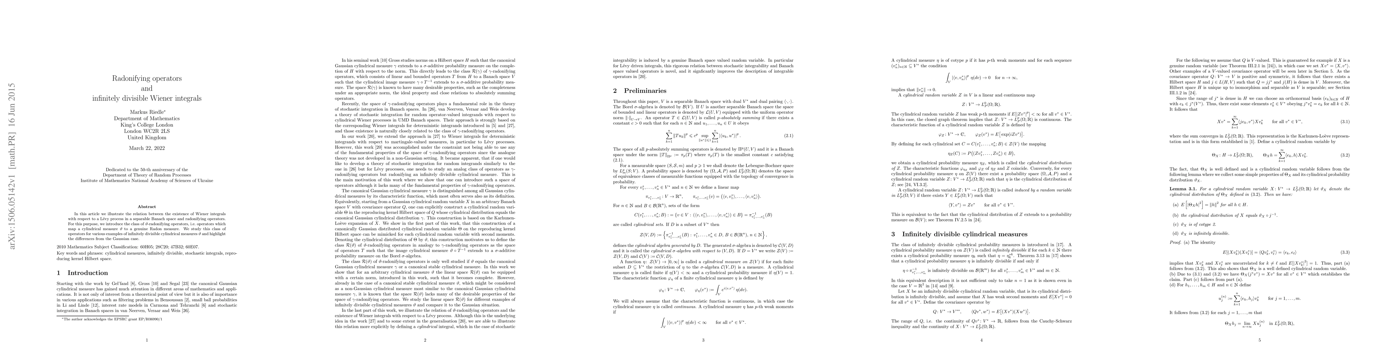 This paper explores the connection between Wiener integrals with respect to a Lévy process and radonifying operators, introducing theta-radonifying operators that map cylindrical measures to Radon measures. It examines these operators for various infinitely divisible cylindrical measures, contrasting them with the Gaussian case.