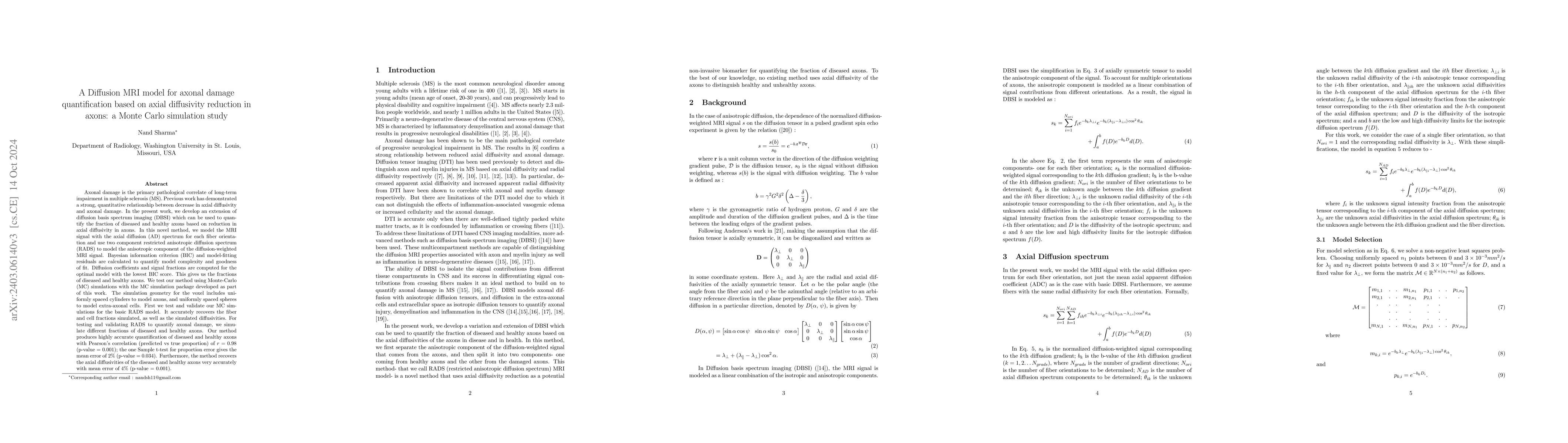 The RADS model extends diffusion basis spectrum imaging to quantify fractions of diseased and healthy axons in multiple sclerosis, modeling MRI signals with restricted anisotropic diffusion spectra and achieving high accuracy in simulations. Its validation demonstrates strong correlation and minimal error in quantifying axonal health.