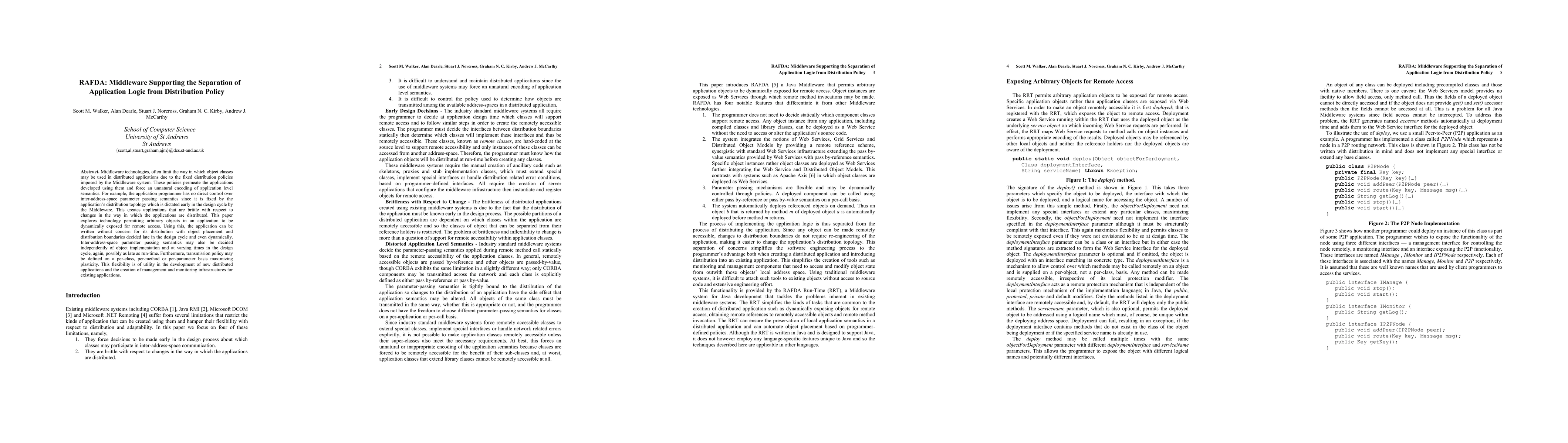 RAFDA is a middleware solution that allows dynamic separation of application logic from distribution policy, enabling flexible object placement and inter-address-space parameter passing without early design constraints. This flexibility enhances both new distributed application development and management of existing applications.
