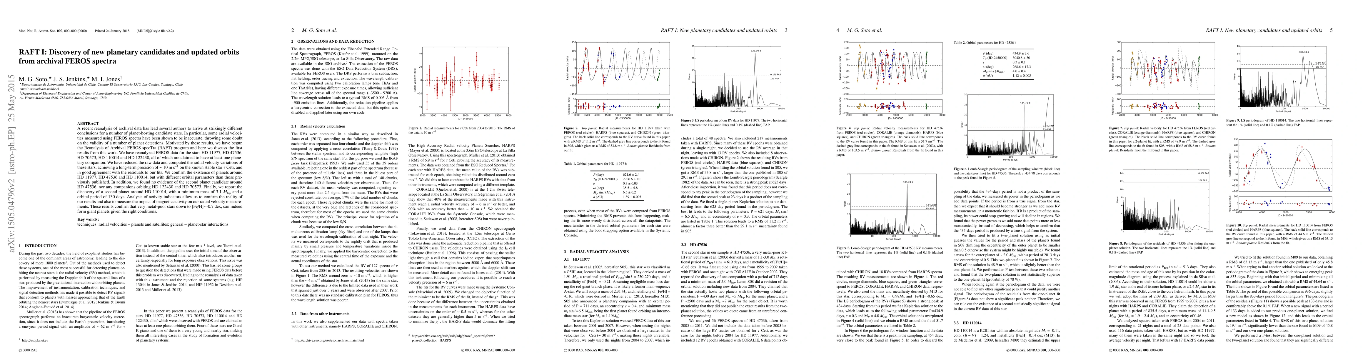 A recent reanalysis of archival data has lead several authors to arrive at strikingly different conclusions for a number of planet-hosting candidate stars. In particular, some radial velocities measured using FEROS spectra have been shown to be inaccurate, throwing some doubt on the validity of a number of planet detections. Motivated by these results, we have begun the Reanalysis of Archival FEROS specTra (RAFT) program and here we discuss the first results from this work. We have reanalyzed FEROS data for the stars HD 11977, HD 47536, HD 70573, HD 110014 and HD 122430, all of which are claimed to have at least one planetary companion. We have reduced the raw data and computed the radial velocity variations of these stars, achieving a long-term precision of $\sim$ 10 m/s on the known stable star tau Ceti, and in good agreement with the residuals to our fits. We confirm the existence of planets around HD 11977, HD 47536 and HD 110014, but with different orbital parameters than those previously published. In addition, we found no evidence of the second planet candidate around HD 47536, nor any companions orbiting HD 122430 and HD 70573. Finally, we report the discovery of a second planet around HD 110014, with a minimum mass of 3.1 Mjup and a orbital period of 130 days. Analysis of activity indicators allow us to confirm the reality of our results and also to measure the impact of magnetic activity on our radial velocity measurements. These results confirm that very metal-poor stars down to [Fe/H]$\sim$ -0.7 dex, can indeed form giant planets given the right conditions.