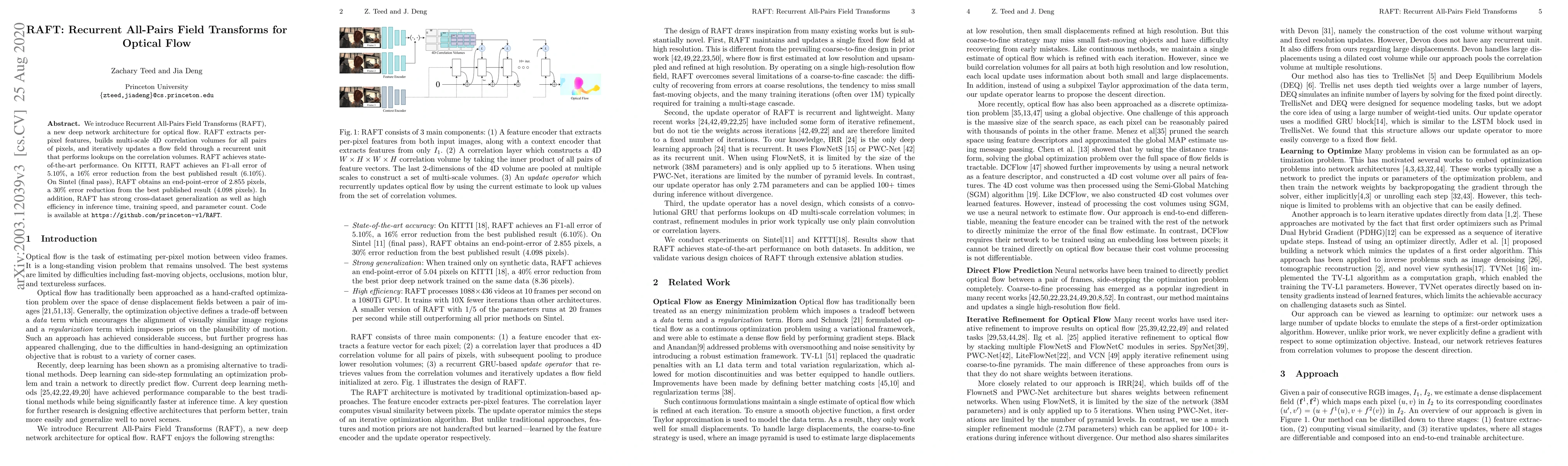 RAFT is a novel deep network architecture for optical flow that uses recurrent all-pairs field transforms to iteratively update a flow field, achieving state-of-the-art performance with significant error reductions on KITTI and Sintel datasets. It also demonstrates high efficiency and strong cross-dataset generalization.