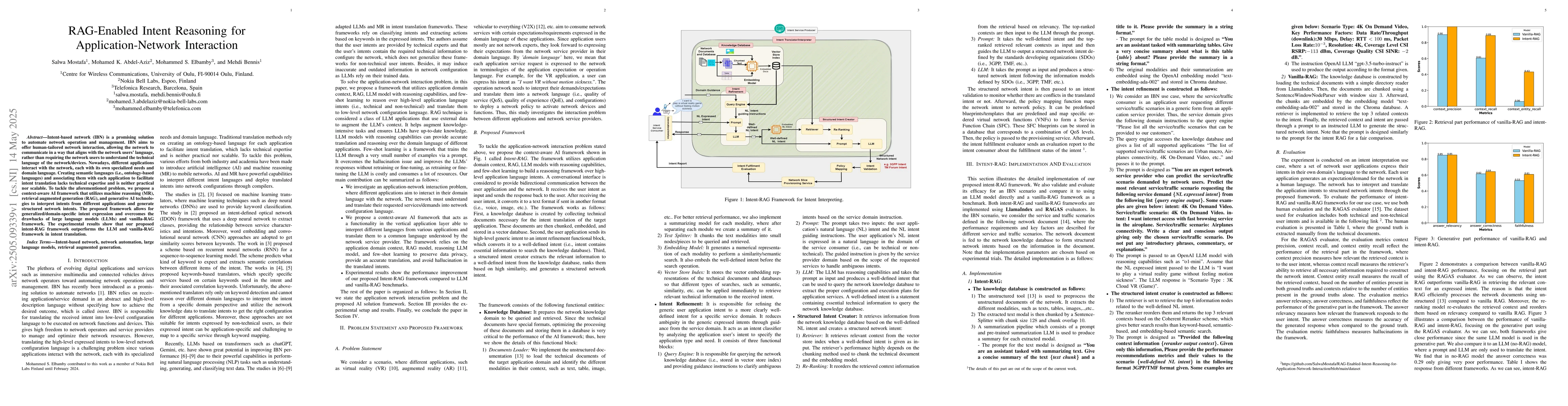 The main technical contribution is a context-aware AI framework combining MR, RAG, and generative AI for intent reasoning in application-network interactions.