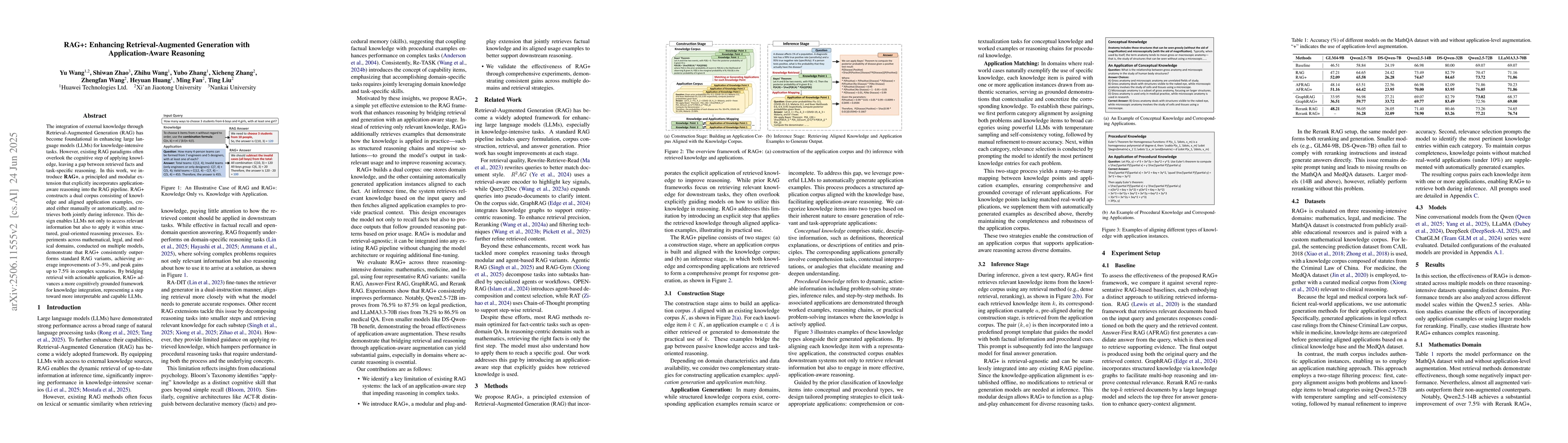 The integration of external knowledge through Retrieval-Augmented Generation (RAG) has become foundational in enhancing large language models (LLMs) for knowledge-intensive tasks. However, existing RAG paradigms often overlook the cognitive step of applying knowledge, leaving a gap between retrieved facts and task-specific reasoning. In this work, we introduce RAG+, a principled and modular extension that explicitly incorporates application-aware reasoning into the RAG pipeline. RAG+ constructs a dual corpus consisting of knowledge and aligned application examples, created either manually or automatically, and retrieves both jointly during inference. This design enables LLMs not only to access relevant information but also to apply it within structured, goal-oriented reasoning processes. Experiments across mathematical, legal, and medical domains, conducted on multiple models, demonstrate that RAG+ consistently outperforms standard RAG variants, achieving average improvements of 3-5%, and peak gains up to 7.5% in complex scenarios. By bridging retrieval with actionable application, RAG+ advances a more cognitively grounded framework for knowledge integration, representing a step toward more interpretable and capable LLMs.