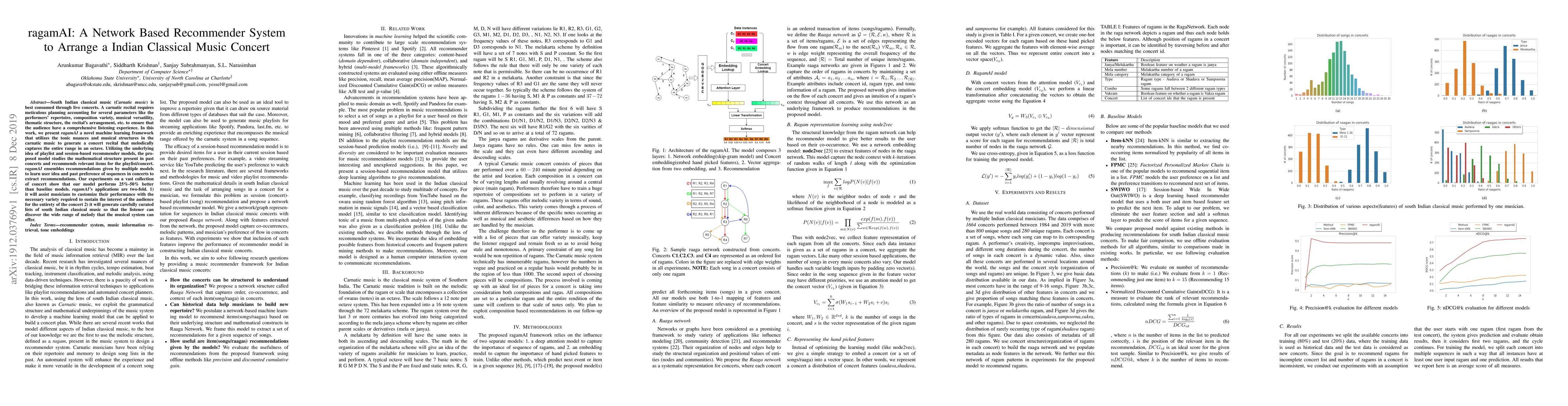 South Indian classical music (Carnatic music) is best consumed through live concerts. A carnatic recital requires meticulous planning accounting for several parameters like the performers' repertoire, composition variety, musical versatility, thematic structure, the recital's arrangement, etc. to ensure that the audience have a comprehensive listening experience. In this work, we present ragamAI a novel machine learning framework that utilizes the tonic nuances and musical structures in the carnatic music to generate a concert recital that melodically captures the entire range in an octave. Utilizing the underlying idea of playlist and session-based recommender models, the proposed model studies the mathematical structure present in past concerts and recommends relevant items for the playlist/concert. ragamAI ensembles recommendations given by multiple models to learn user idea and past preference of sequences in concerts to extract recommendations. Our experiments on a vast collection of concert show that our model performs 25%-50% better than baseline models. ragamAI's applications are two-fold. 1) it will assist musicians to customize their performance with the necessary variety required to sustain the interest of the audience for the entirety of the concert 2) it will generate carefully curated lists of south Indian classical music so that the listener can discover the wide range of melody that the musical system can offer.