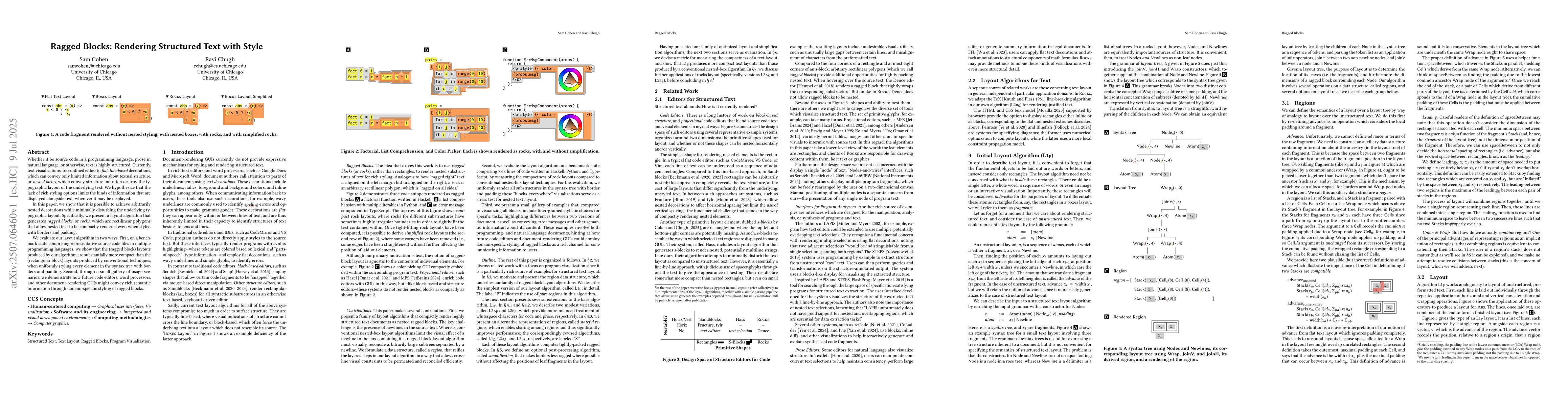 Whether it be source code in a programming language, prose in natural language, or otherwise, text is highly structured. Currently, text visualizations are confined either to _flat, line-based_ decorations, which can convey only limited information about textual structure, or _nested boxes_, which convey structure but often destroy the typographic layout of the underlying text. We hypothesize that the lack of rich styling options limits the kinds of information that are displayed alongside text, wherever it may be displayed. In this paper, we show that it is possible to achieve arbitrarily nested decorations while minimally disturbing the underlying typographic layout. Specifically, we present a layout algorithm that generates _ragged blocks_, or _rocks_, which are rectilinear polygons that allow nested text to be compactly rendered even when styled with borders and padding. We evaluate our layout algorithm in two ways. First, on a benchmark suite comprising representative source code files in multiple programming languages, we show that the (ragged block) layouts produced by our algorithm are substantially more compact than the (rectangular block) layouts produced by conventional techniques, when uniformly styling every element in the syntax tree with borders and padding. Second, through a small gallery of usage scenarios, we demonstrate how future code editors, word processors, and other document-rendering GUIs might convey rich semantic information through domain-specific styling of ragged blocks.
