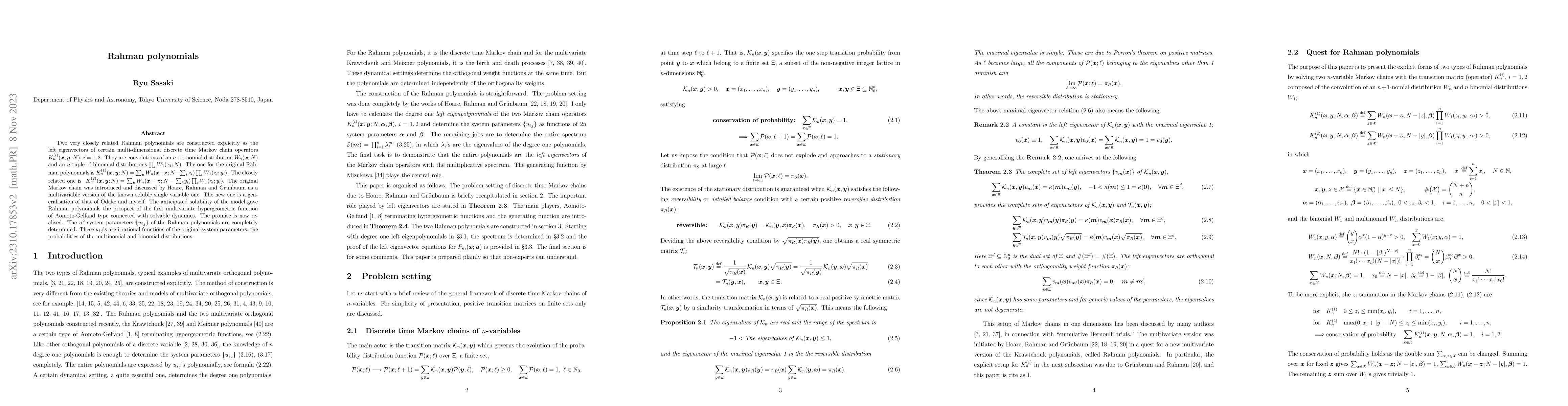 This paper constructs two closely related Rahman polynomials, identified as left eigenvectors of specific multi-dimensional Markov chain operators. The polynomials are convolutions of particular distributions and offer the first multivariate hypergeometric function linked to solvable dynamics, determining all $n^2$ system parameters.